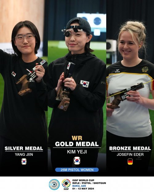 한편 10일 여자 25m 권총 2차전 결선에선 김예지(임실군청)와 양지인(한국체대)이 각각 42점, 38점을 쏴 금메달과 은메달을 목에 걸었다. 성인국제대회에서 한국사격이 1, 2위로 시상대에 오른 것은 2012런던올림픽 남자 50m 권총 진종오(1위), 최영래(2위) 이후 12년만으로 여자부는 처음이다. 특히 이 종목 세계랭킹 1위 김예지의 42점은 1월 자카르타 아시아선수권대회 당시 양지인이 수립한 세계기록(41점)을 1점 넘어선 신기록이다.