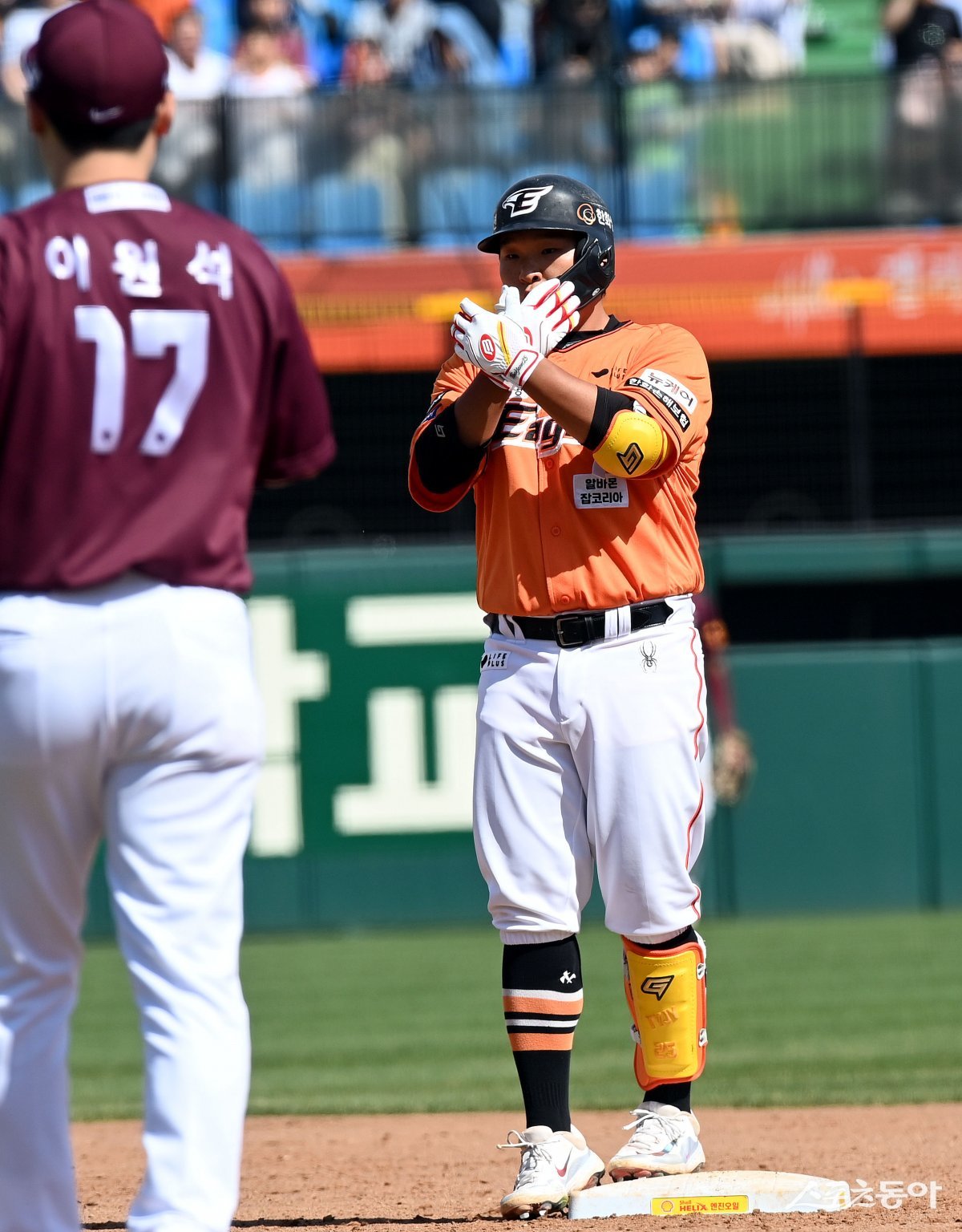 12일 한화생명 이글스파크에서 ‘2024 신한 SOL 뱅크 KBO리그’ 한화 이글스와 키움 히어로즈의 경기가 열렸다. 5회말 1사 1, 2루에서 한화 김태연이 1타점 2루타를 날린 후 세리머니를 펼치고 있다.