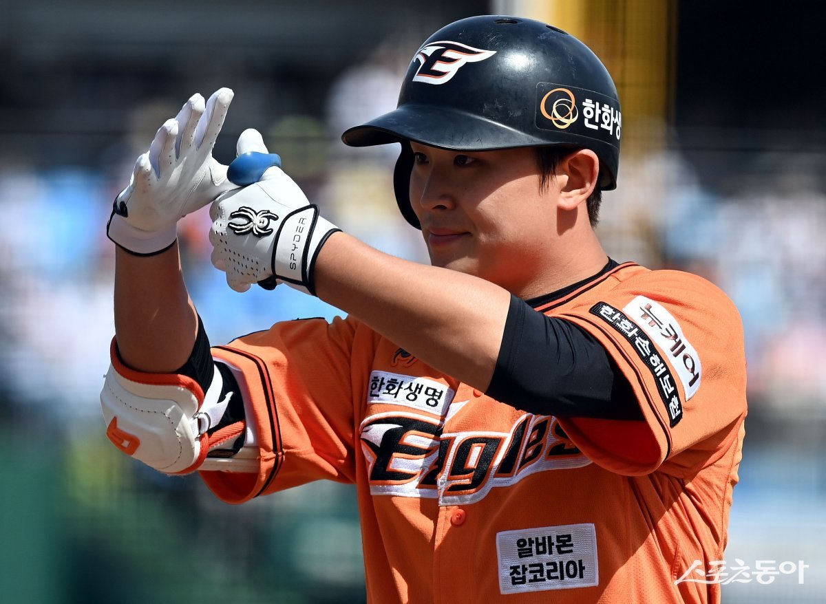 12일 한화생명 이글스파크에서 ‘2024 신한 SOL 뱅크 KBO리그’ 한화 이글스와 키움 히어로즈의 경기가 열렸다. 4회말 무사 만루에서 한화 정은원이 안타를 날린 후 세리머니를 펼치고 있다.