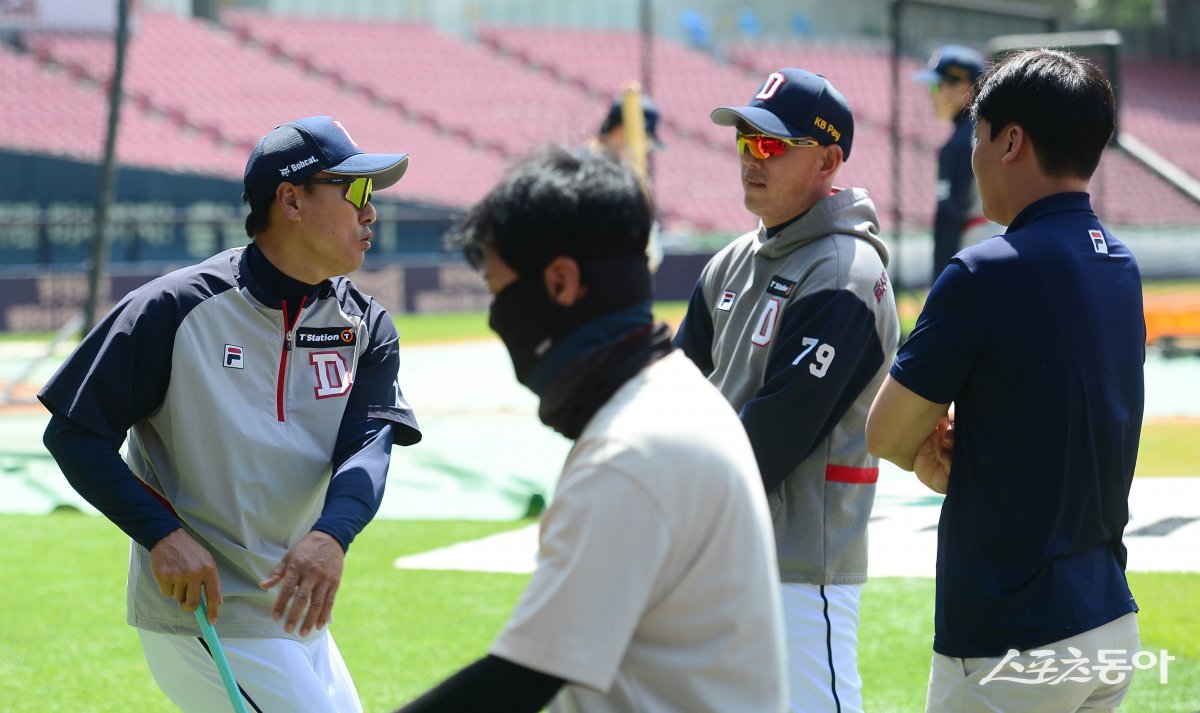 12일 서울 잠실야구장에서 열린 ‘2024 신한 SOL 뱅크 KBO리그’ 두산 베어스와 KT 위즈의 더블헤더 1차전 경기에 앞서 두산 이승엽 감독과 박정배 코치가 이야기를 하고 있다.