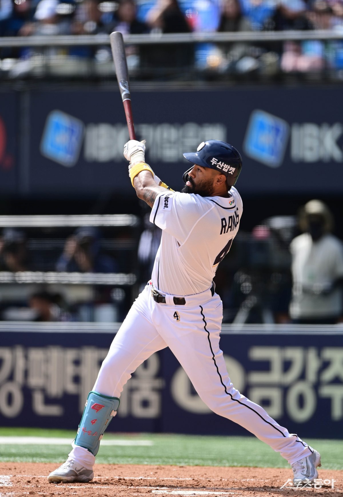 12일 서울 잠실야구장에서 열린 ‘2024 신한 SOL 뱅크 KBO리그’ 두산 베어스와 KT 위즈의 더블헤더 1차전 경기에서 3회말 무사 1루 두산 라모스가 1타점 중전 2루타를 치고 있다.