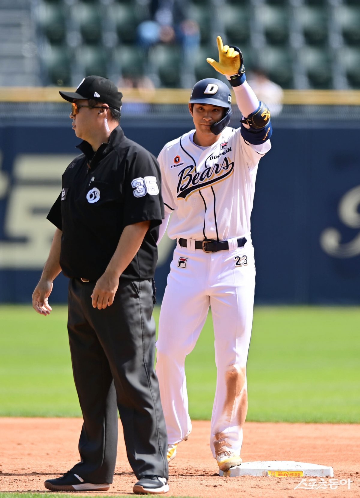 12일 서울 잠실야구장에서 열린 ‘2024 신한 SOL 뱅크 KBO리그’ 두산 베어스와 KT 위즈의 더블헤더 1차전 경기에서 2회말 1사 만루 두산 강승호가 좌전 2타점 2루타를 친 후 세리머니를 하고 있다.