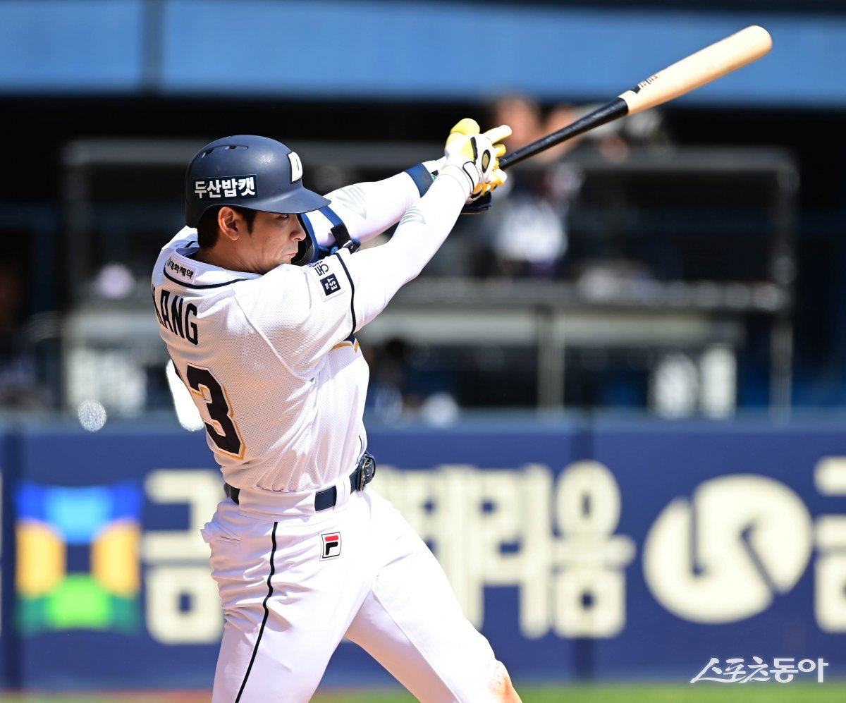 12일 서울 잠실야구장에서 열린 ‘2024 신한 SOL 뱅크 KBO리그’ 두산 베어스와 KT 위즈의 더블헤더 1차전 경기에서 2회말 1사 만루 두산 강승호가 좌전 2타점 2루타를 치고 있다.
