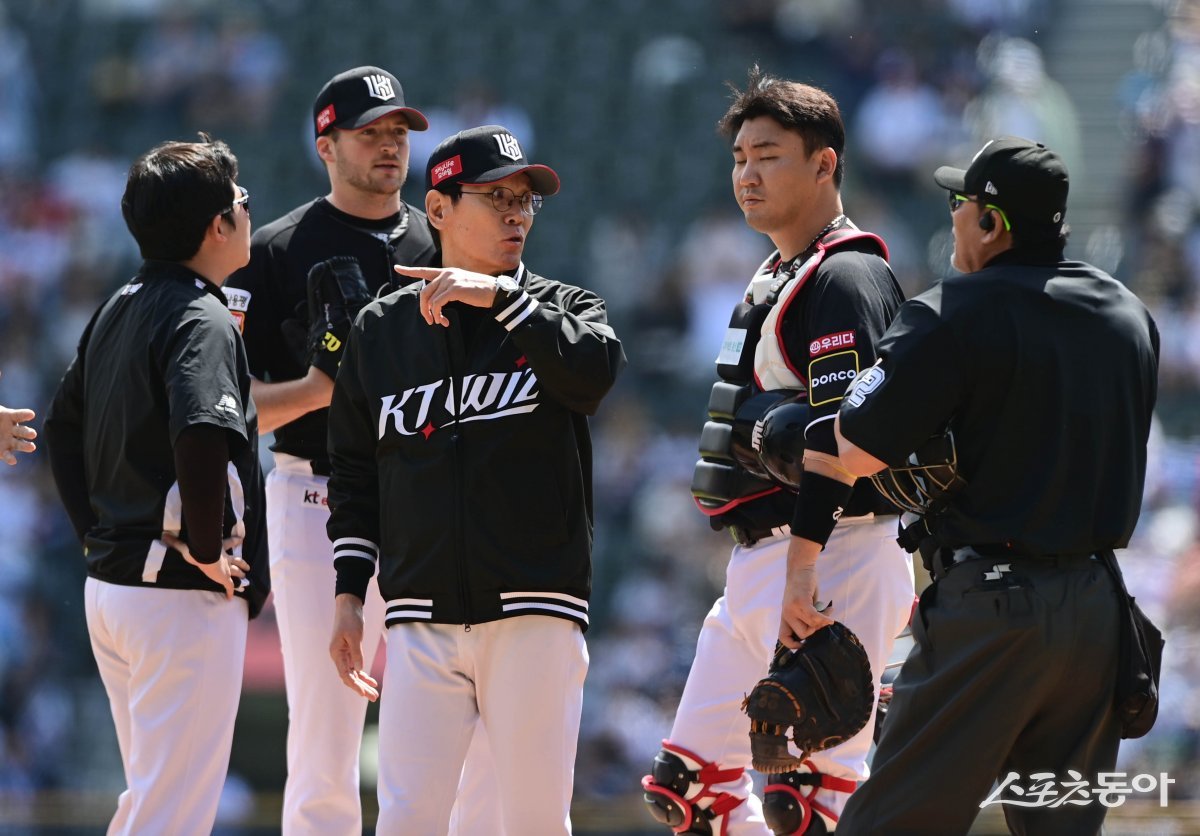 12일 서울 잠실야구장에서 열린 ‘2024 신한 SOL 뱅크 KBO리그’ 두산 베어스와 KT 위즈의 더블헤더 1차전 경기에서 2회말 무사 2, 3루 상황에서 KT 이강철 감독이 벤자민의 교체를 지시하고 있다.