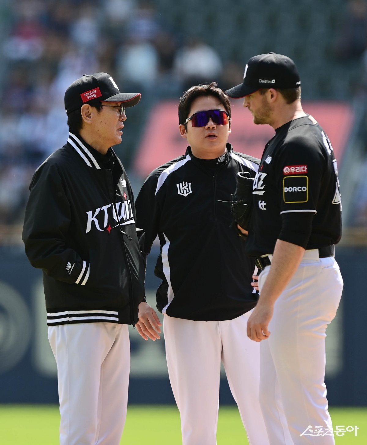 12일 서울 잠실야구장에서 열린 ‘2024 신한 SOL 뱅크 KBO리그’ 두산 베어스와 KT 위즈의 더블헤더 1차전 경기에서 2회말 무사 2, 3루 상황에서 KT 이강철 감독과 벤자민이 이야기를 하고 있다.