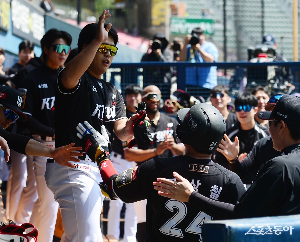 12일 서울 잠실야구장에서 열린 ‘2024 신한 SOL 뱅크 KBO리그’ 두산 베어스와 KT 위즈의 더블헤더 1차전 경기에서 1회초 1사 KT 문상철이 솔로 홈런을 친 후 강백호의 축하를 받고 있다.