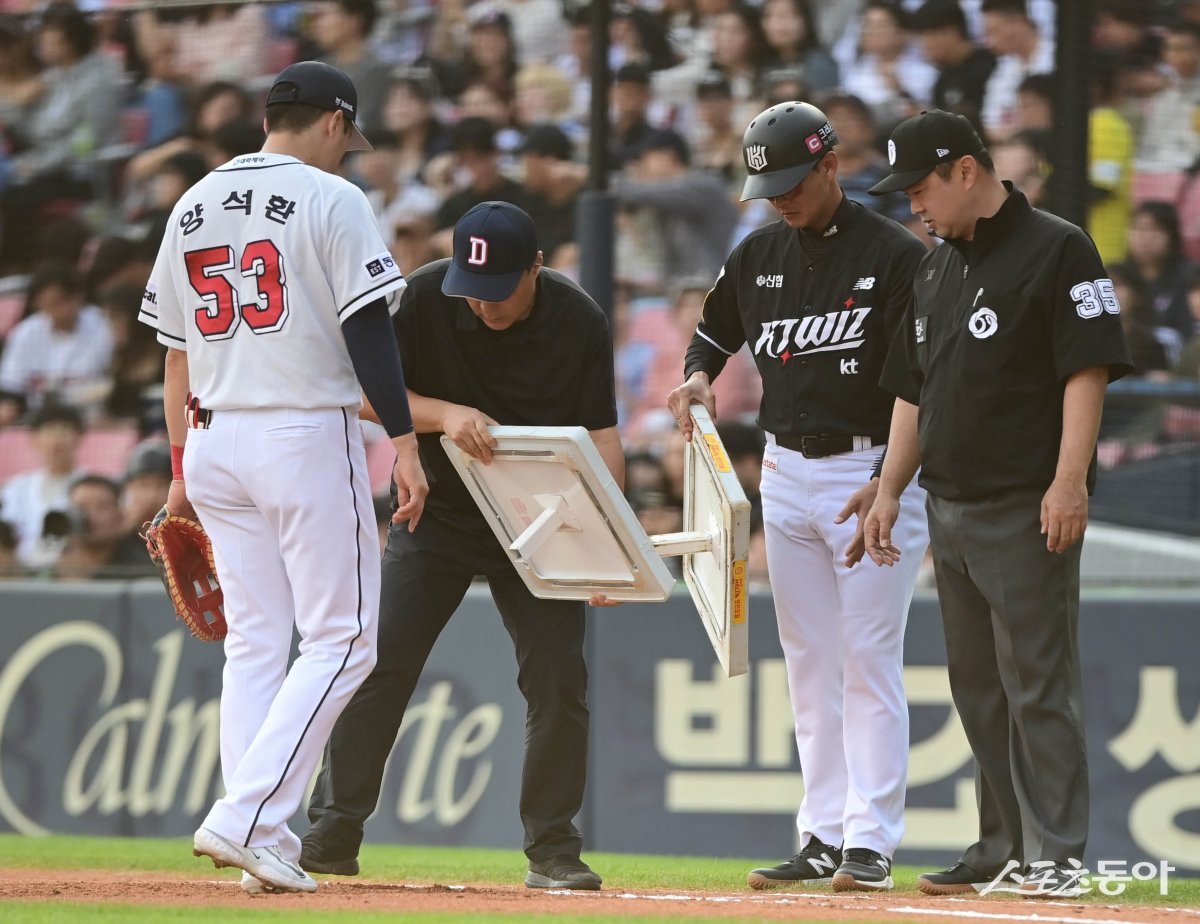 12일 서울 잠실야구장에서 열린 ‘2024 신한 SOL 뱅크 KBO리그’ 두산 베어스와 KT 위즈의 더블헤더 2차전 경기에서 2회말 시작 전 구장 관리인이 1루 베이스를 교체하고 있다.