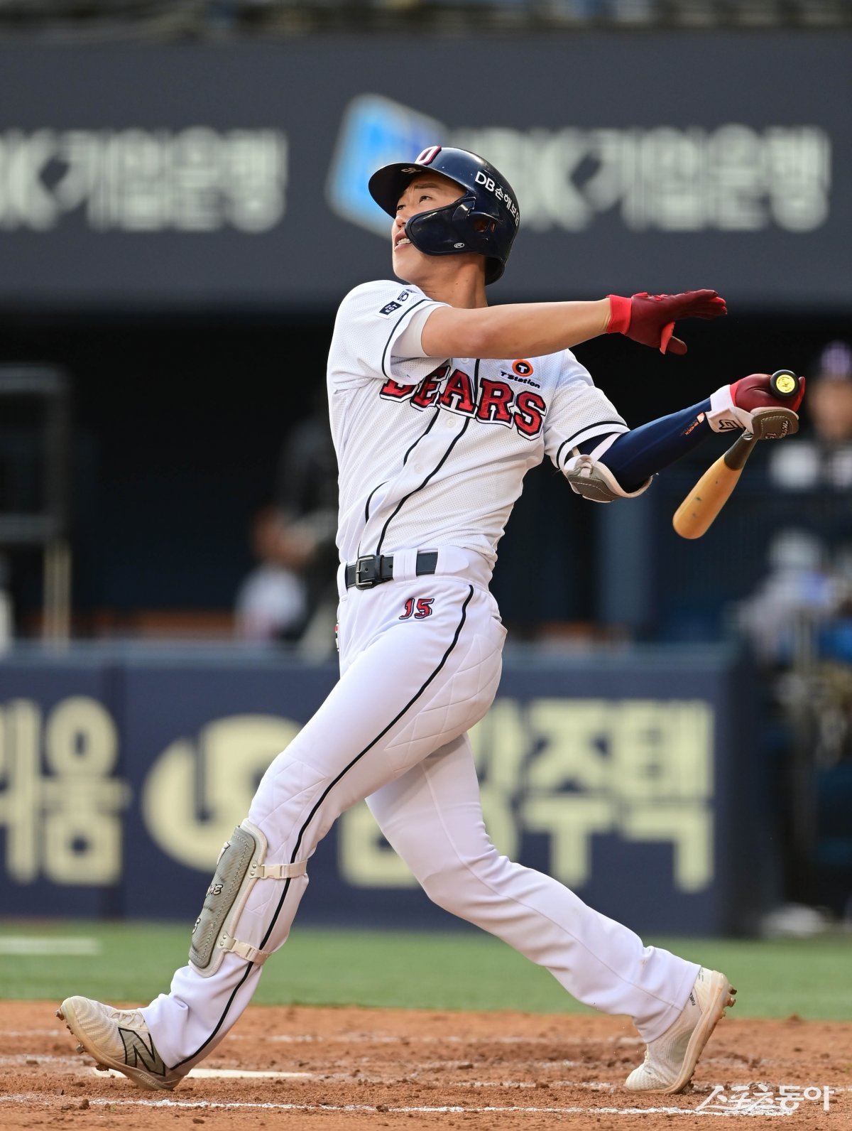 12일 서울 잠실야구장에서 열린 ‘2024 신한 SOL 뱅크 KBO리그’ 두산 베어스와 KT 위즈의 더블헤더 2차전 경기에서 3회말 2사 1루 두산 전민재가 좌월 2점 홈런을 치고 있다.