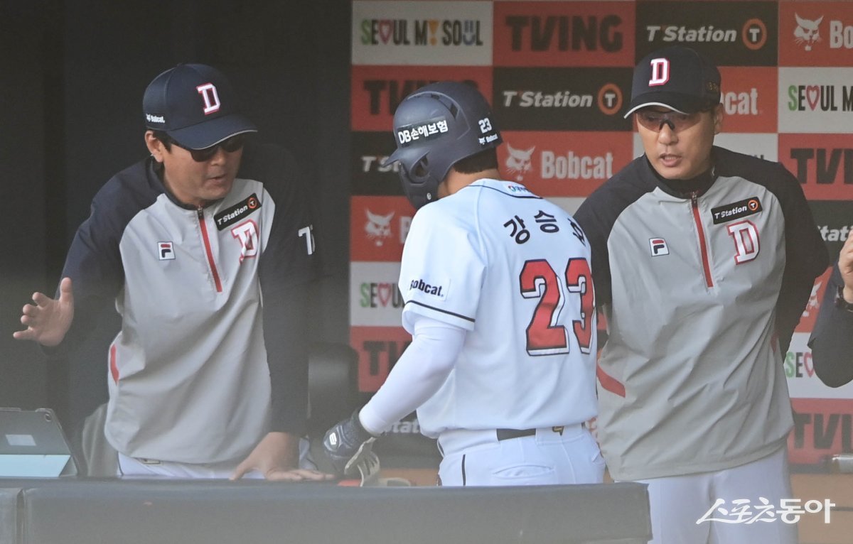 12일 서울 잠실야구장에서 열린 ‘2024 신한 SOL 뱅크 KBO리그’ 두산 베어스와 KT 위즈의 더블헤더 2차전 경기에서 1회말 무사 2루 두산의 적시타 때 득점에 성공한 2루주자 강승호가 이승엽 감독의 축하를 받고 있다.