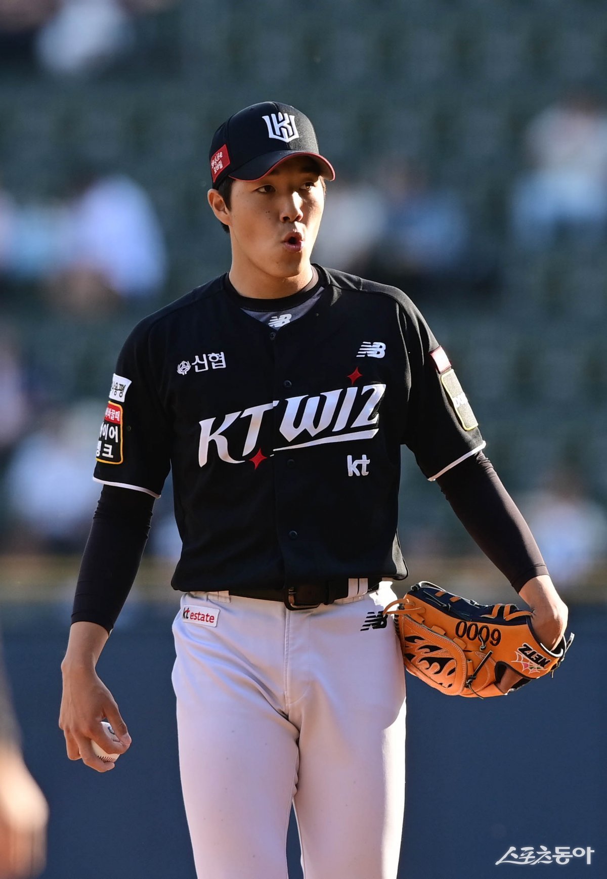 12일 서울 잠실야구장에서 열린 ‘2024 신한 SOL 뱅크 KBO리그’ 두산 베어스와 KT 위즈의 더블헤더 2차전 경기에서 1회말 무사 1, 2루 상황에서 KT 육청명이 숨을 몰아쉬고 있다.