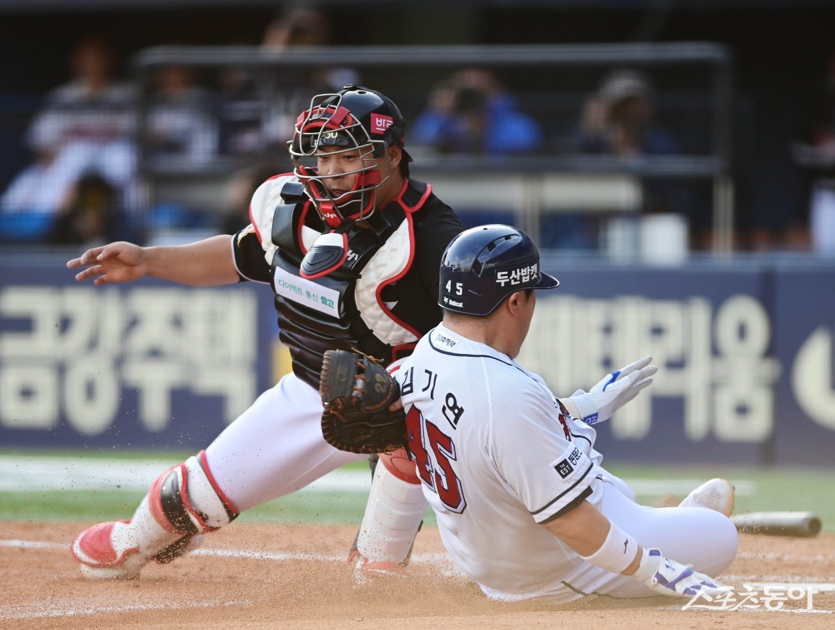 12일 서울 잠실야구장에서 열린 ‘2024 신한 SOL 뱅크 KBO리그’ 두산 베어스와 KT 위즈의 더블헤더 2차전 경기에서 2회말 1사 2루 두산의 중전 안타 때 KT 포수 강백호가 2루주자를 태그 아웃시키고 있다.