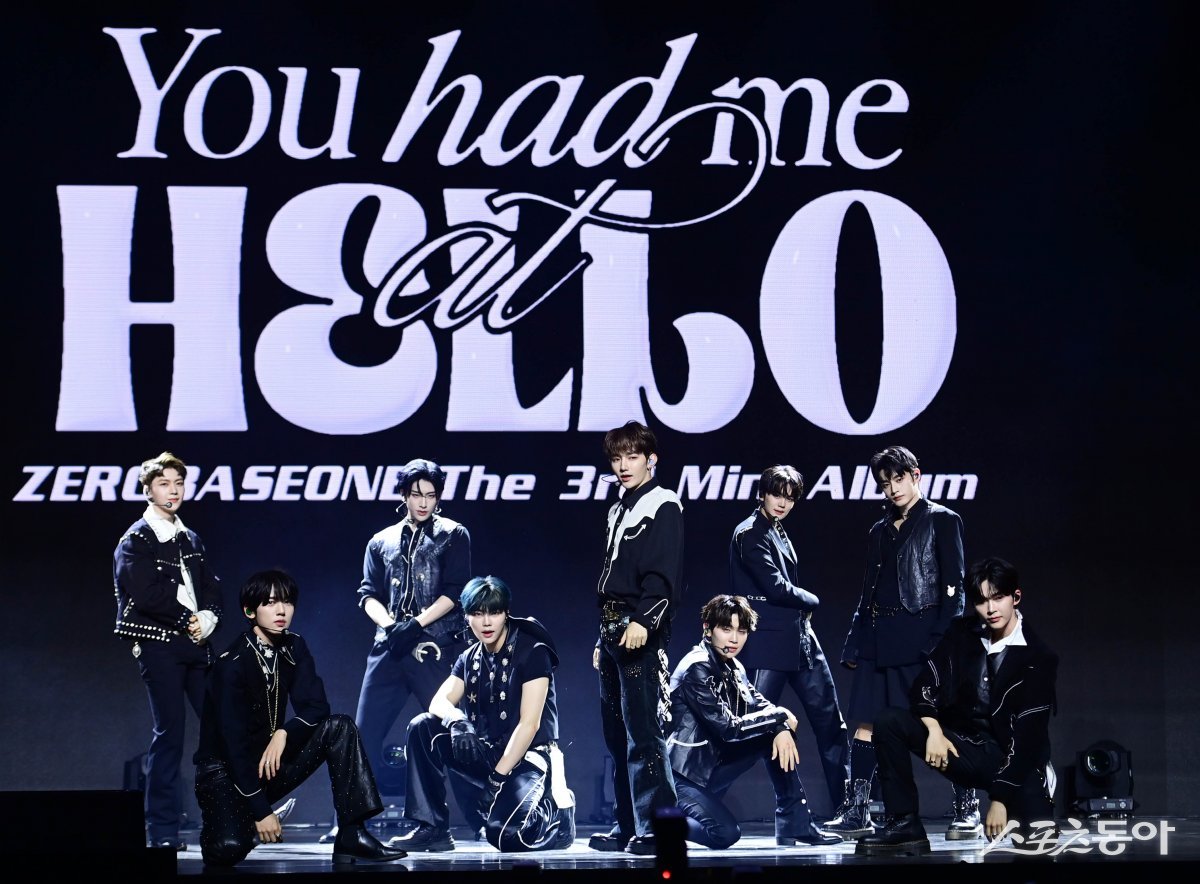 그룹 제로베이스원이 13일 서울 용산구 한남동 블루스퀘어 마스터카드홀에서 열린 미니앨범 3집 ‘You had me at HELLO’ 발매 기념 프레스 쇼케이스에서 타이틀곡 ‘Feel the POP’ 무대를 펼치고 있다.
