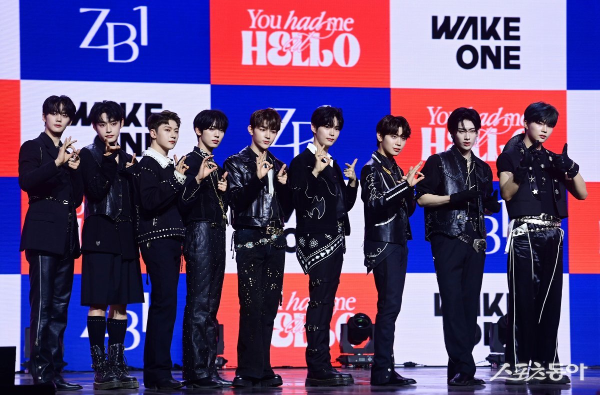 그룹 제로베이스원이 13일 서울 용산구 한남동 블루스퀘어 마스터카드홀에서 열린 미니앨범 3집 ‘You had me at HELLO’ 발매 기념 프레스 쇼케이스에서 포즈를 취하고 있다.