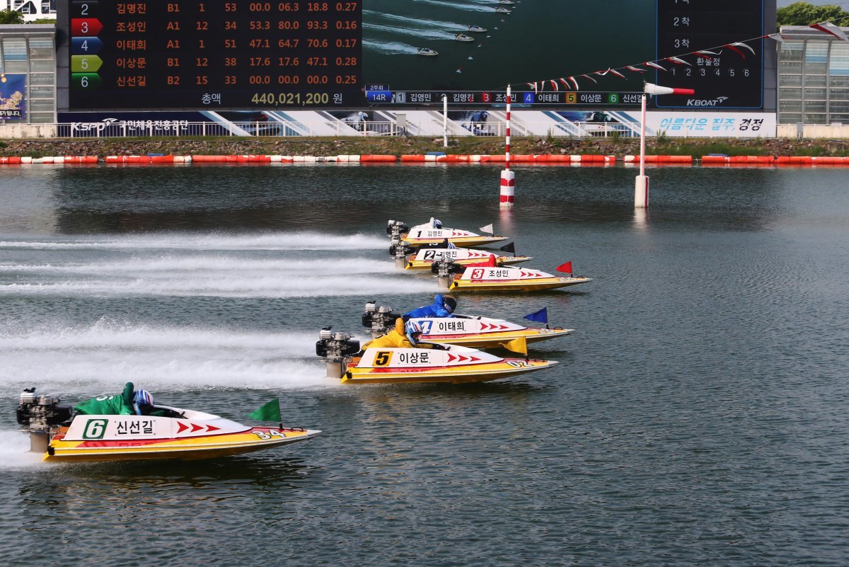 사진=미사리경정장에서 선수들이 반환점을 돌며 치열한 경합을 벌이고 있다