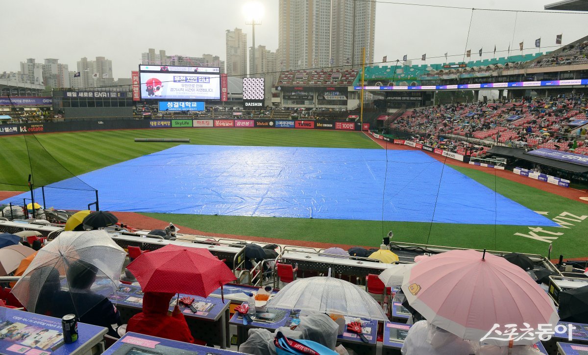 15일 수원KT위즈파크에서 열릴 ‘2024 신한은행 SOL뱅크 KBO리그’ 롯데 자이언츠와 KT 위즈 경기가 우천으로 지연되고 있다.