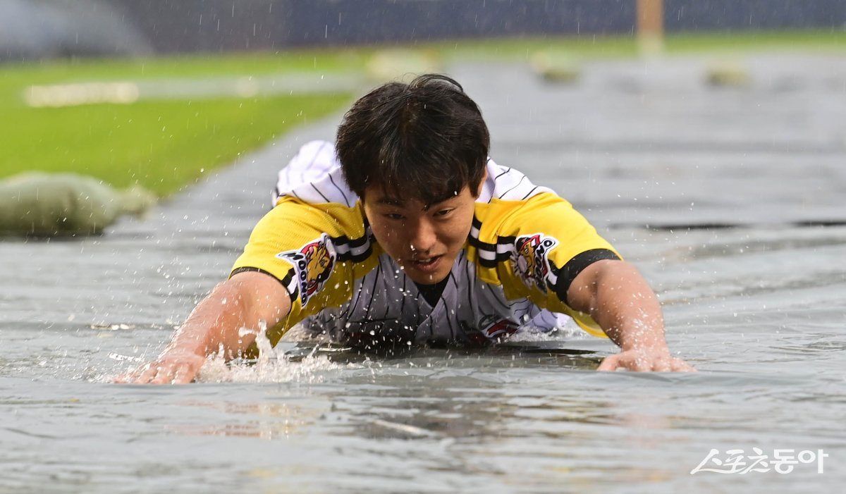 15일 서울 잠실야구장에서 열린 ‘2024 신한 SOL 뱅크 KBO리그’ LG 트윈스와 키움 히어로즈의 경기가 우천으로 인해 취소됐다. LG 최승민이 우천 취소 세리머니를 하고 있다.