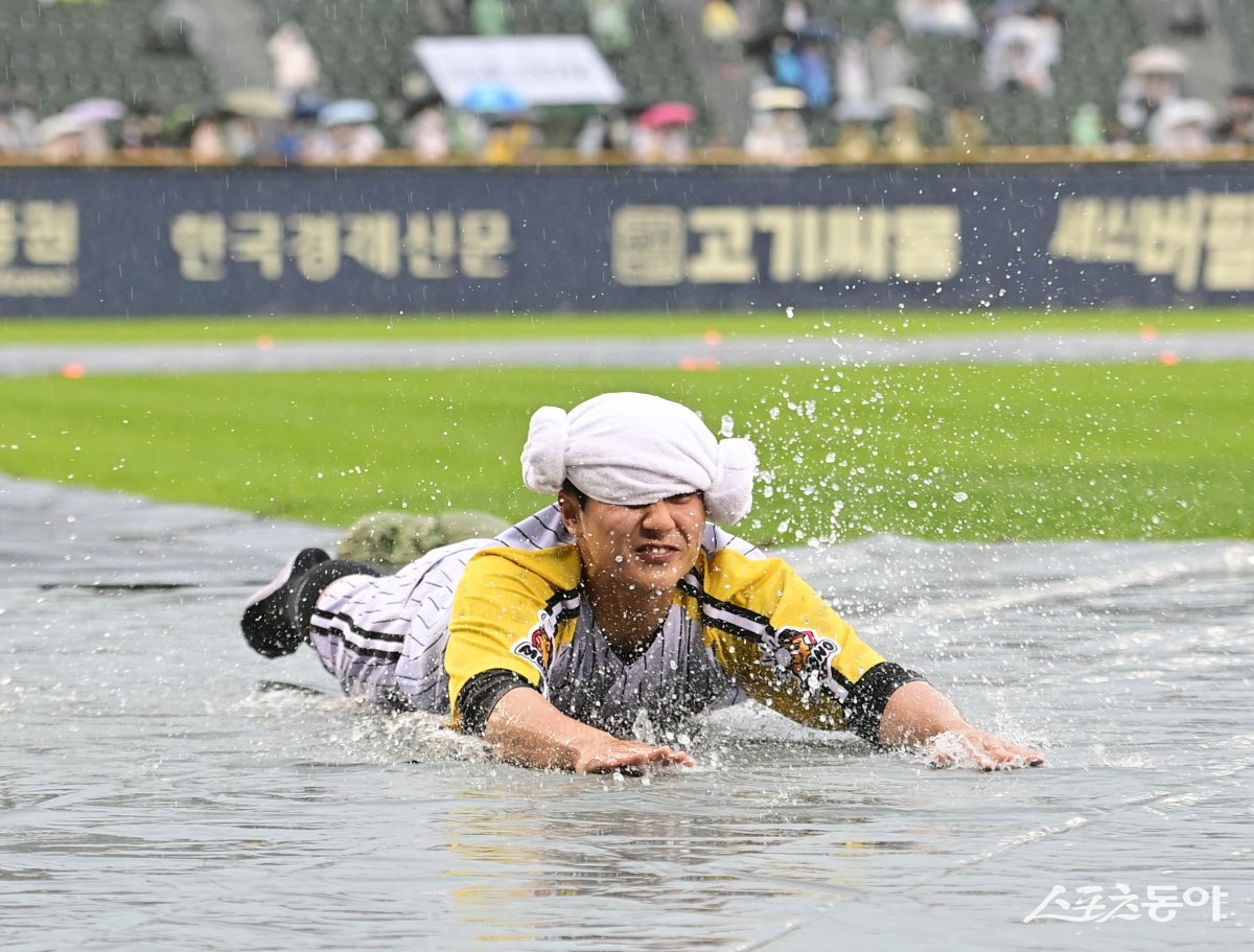 15일 서울 잠실야구장에서 열린 ‘2024 신한 SOL 뱅크 KBO리그’ LG 트윈스와 키움 히어로즈의 경기가 우천으로 인해 취소됐다. LG 최원영이 우천 취소 세리머니를 하고 있다.