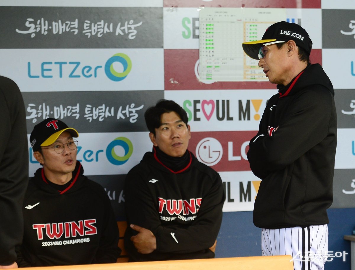 15일 서울 잠실야구장에서 열린 ‘2024 신한 SOL 뱅크 KBO리그’ LG 트윈스와 키움 히어로즈의 경기가 우천으로 인해 지연되고 있다. LG 염경엽 감독이 코치들과 이야기를 하고 있다.