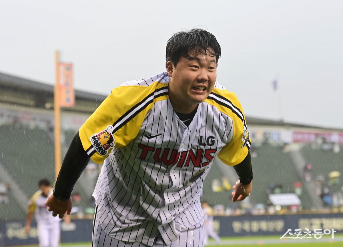 15일 서울 잠실야구장에서 열린 ‘2024 신한 SOL 뱅크 KBO리그’ LG 트윈스와 키움 히어로즈의 경기가 우천으로 인해 취소됐다. LG 김범석이 우천 취소 세리머니를 하고 있다.