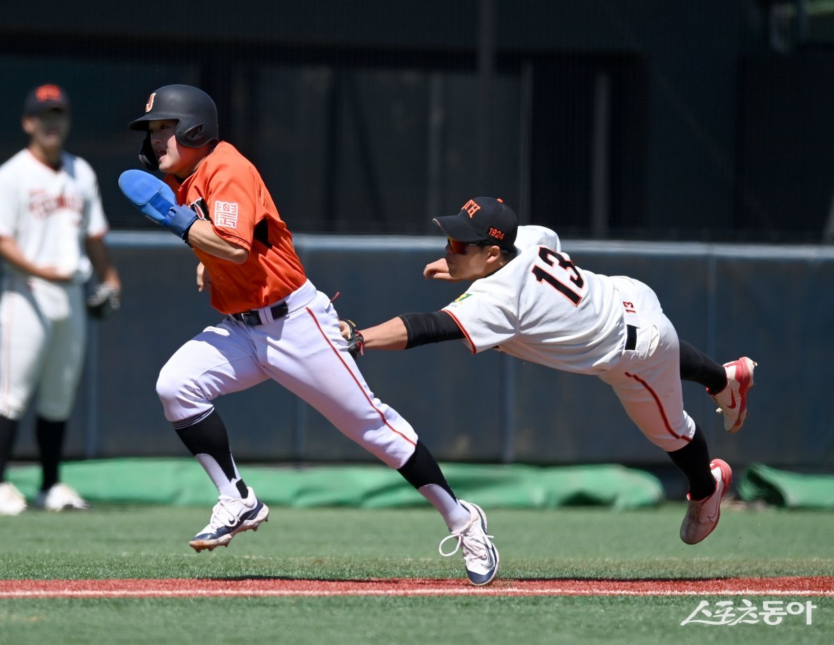 16일 서울 목동야구장에서 ‘제 78회 황금사자기 전국고교야구대회 겸 주말리그 왕중왕전’ 제주고와 부산공고의 서스펜디드 경기가 열렸다. 7회초 2사 만루 제주고 안타 때 2루주자 하지웅이 협살에 걸렸으나 태그를 피해 득점에 성공하고 있다.