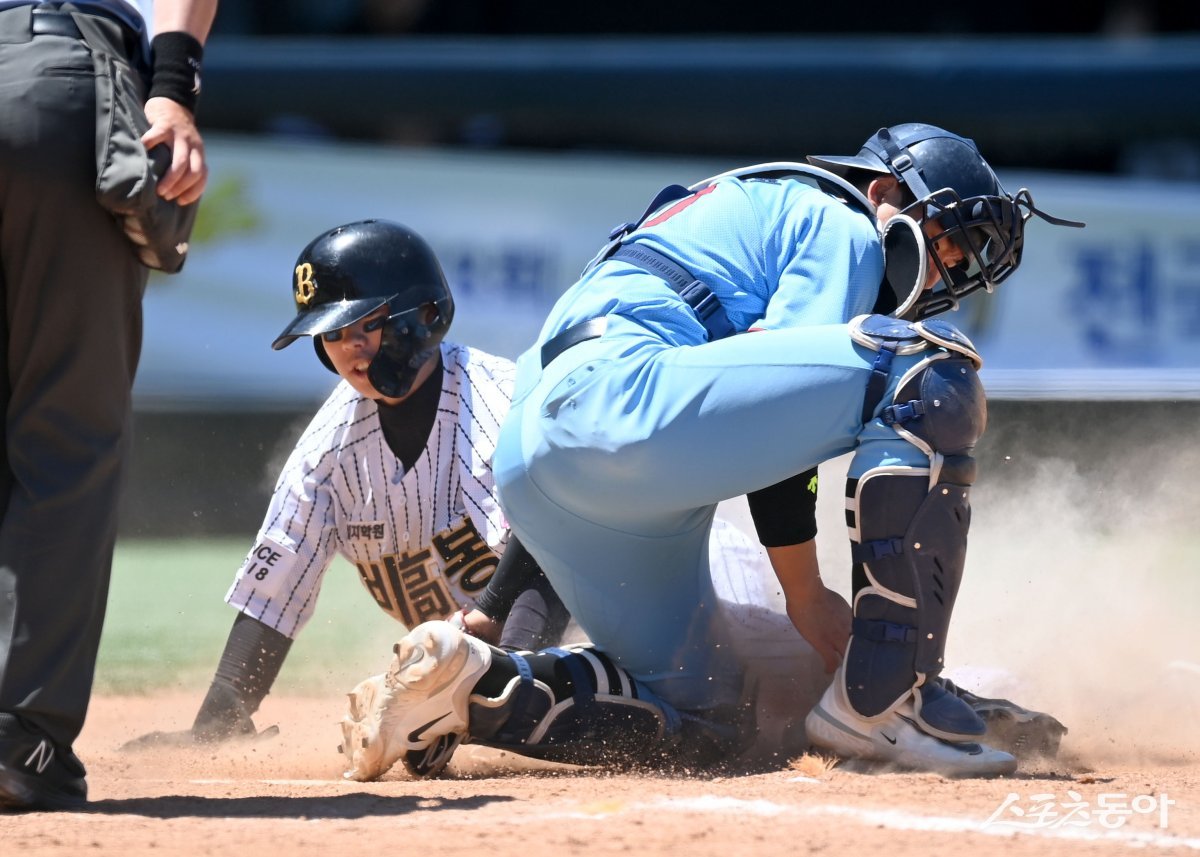 16일 서울 목동야구장에서 ‘제 78회 황금사자기 전국고교야구대회 겸 주말리그 왕중왕전’ 비봉고와 휘문고 경기가 열렸다. 5회초 1사 3루 비봉고 내야 땅볼 때 3루주자 정현근이 홈으로 달려 세이프 되고 있다.