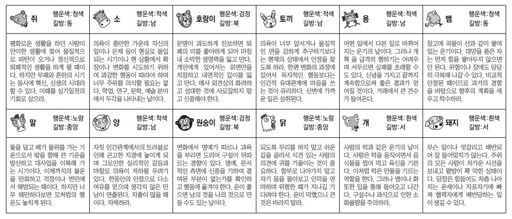 쥐띠: 평화로운 생활을 하던 사람이 안이한 생활에 젖어 물질적으로 파탄이 오거나 정신적으로 퇴폐적인 생활을 하게 될 때이다. 하지만 부패와 혼란의 시기는 동시에 혁신, 신생의 시대라 할 수 있다. 이때를 심기일전의 기회로 삼으라. 소띠: 의욕이 충만한 가운데 자신의 일이나 문제 등이 현실로 돌입되는 시기이니 현 상황에서 확장이나 변화를 시도하기 위하여 과감한 행동이 따라야 하며 너무 주위를 의식할 필요는 없다. 학업, 연구, 문학, 예술 분야에서 두각을 나타내는 날이다.