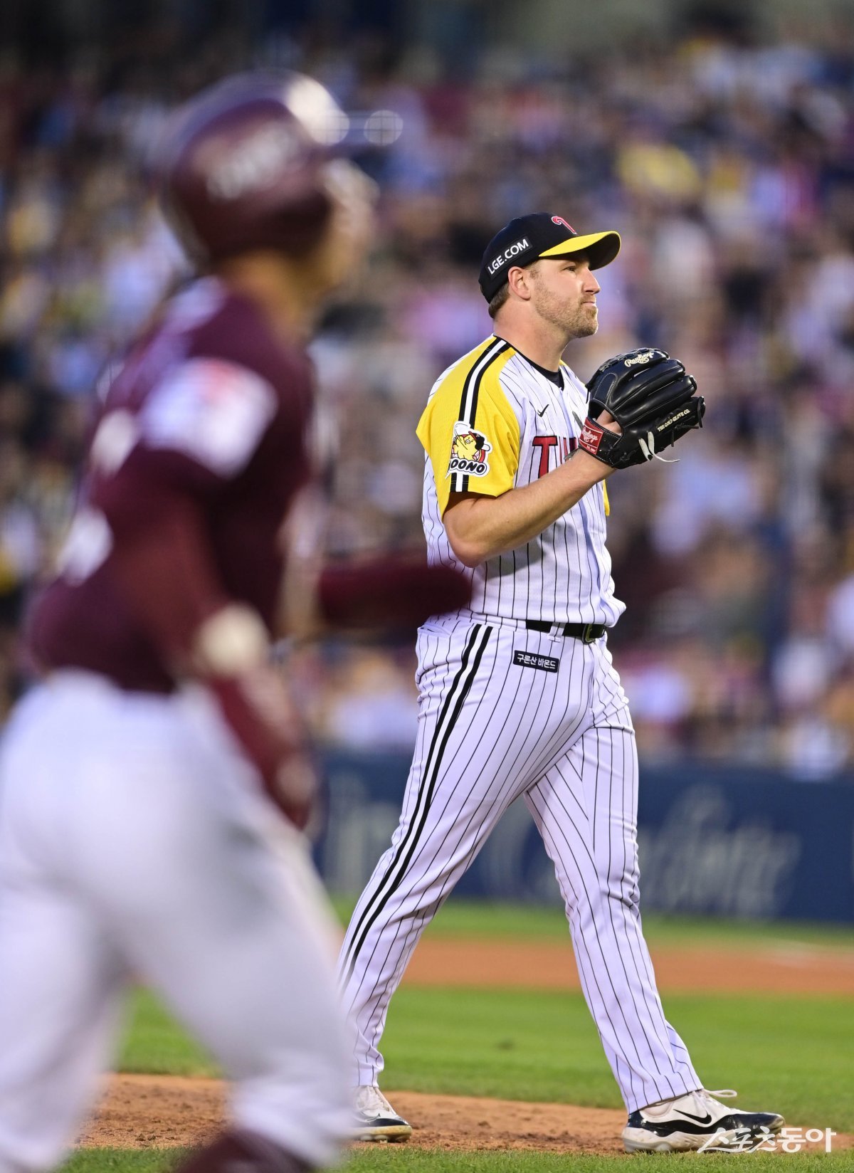 16일 서울 잠실야구장에서 열린 ‘2024 신한 SOL 뱅크 KBO리그’ LG 트윈스와 키움 히어로즈의 경기에서 3회초 2사 만루 키움에 밀어내기 볼넷으로 실점한 LG 엔스가 아쉬워하고 있다.