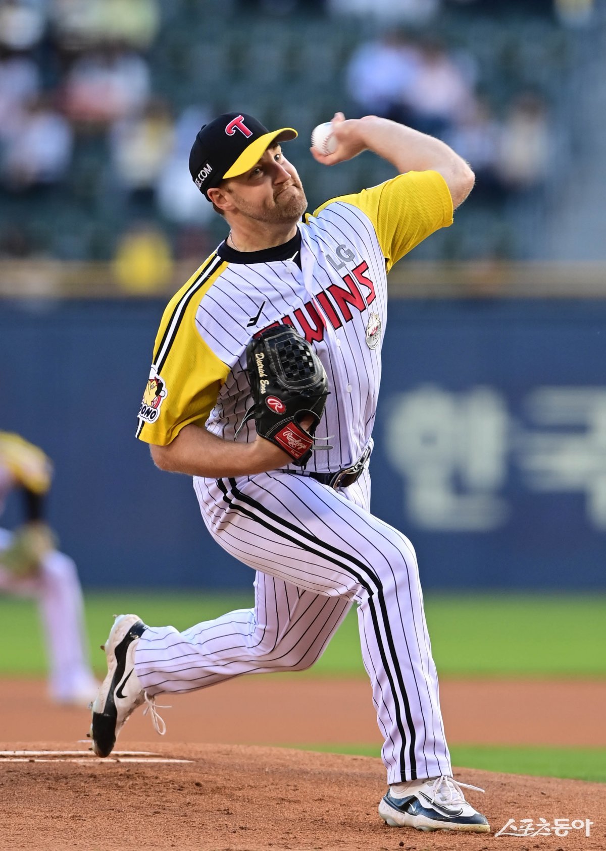 16일 서울 잠실야구장에서 열린 ‘2024 신한 SOL 뱅크 KBO리그’ LG 트윈스와 키움 히어로즈의 경기에서 LG 선발 투수 엔스가 역투하고 있다.