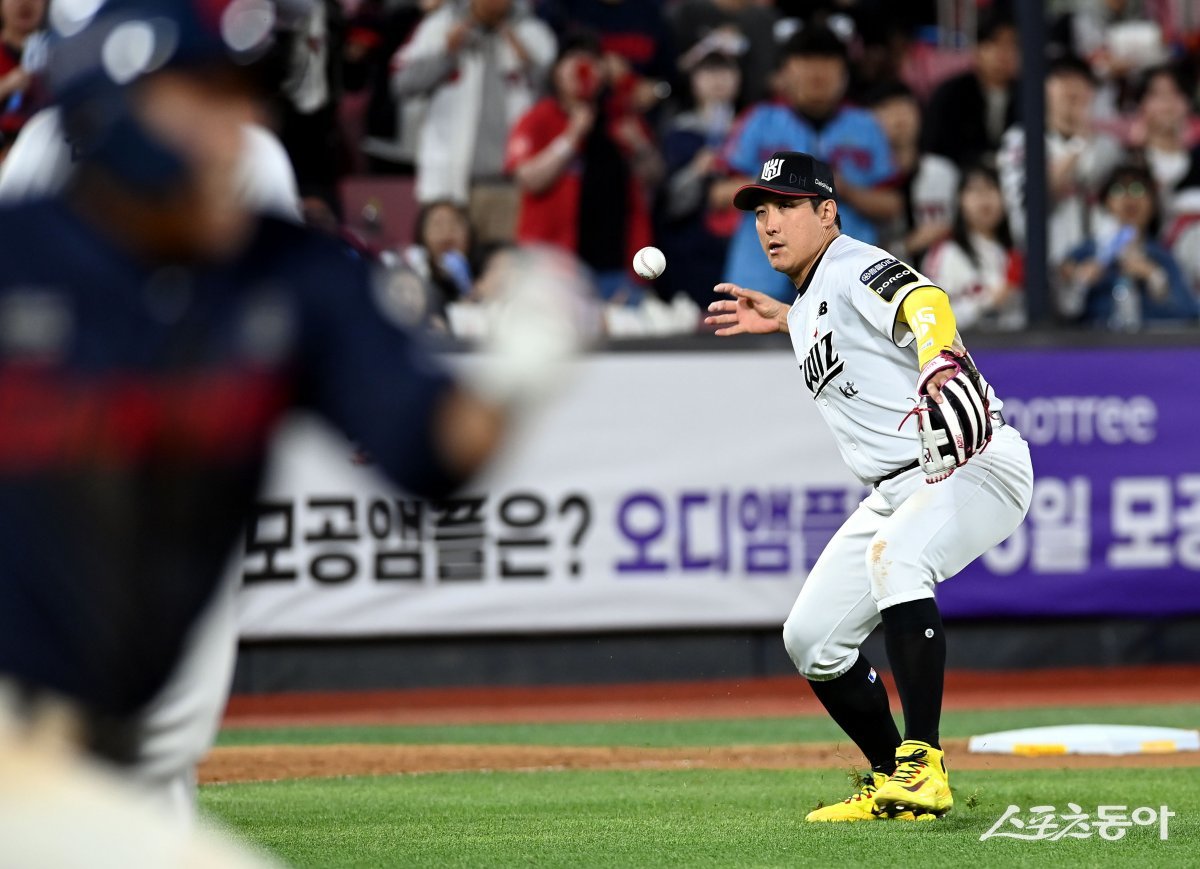 16일 경기도 수원 KT위즈파크에서 ‘2024 신한 SOL 뱅크 KBO리그’ KT 위즈와 롯데 자이언츠의 경기가 열렸다. 8회초 1사에서 내야 안타 타구를 잡은 KT 황재균이 1루 송구를 시도하다 볼을 놓치고 있다.