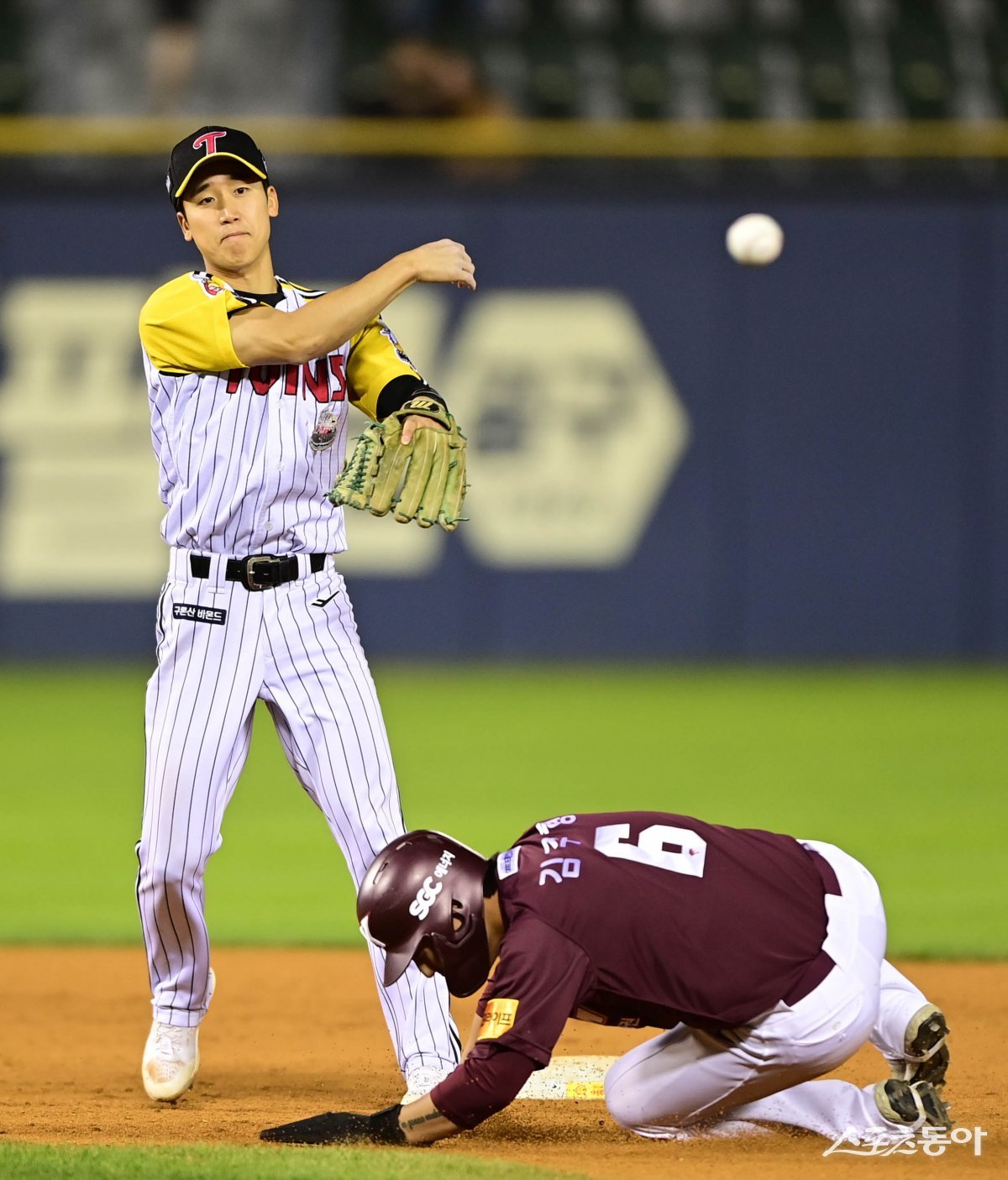 16일 서울 잠실야구장에서 열린 ‘2024 신한 SOL 뱅크 KBO리그’ LG 트윈스와 키움 히어로즈의 경기에서 8회초 1사 1, 3루 키움의 땅볼 때 LG 구본혁이 1루주자를 포스 아웃시킨 후 1루로 송구하고 있다.