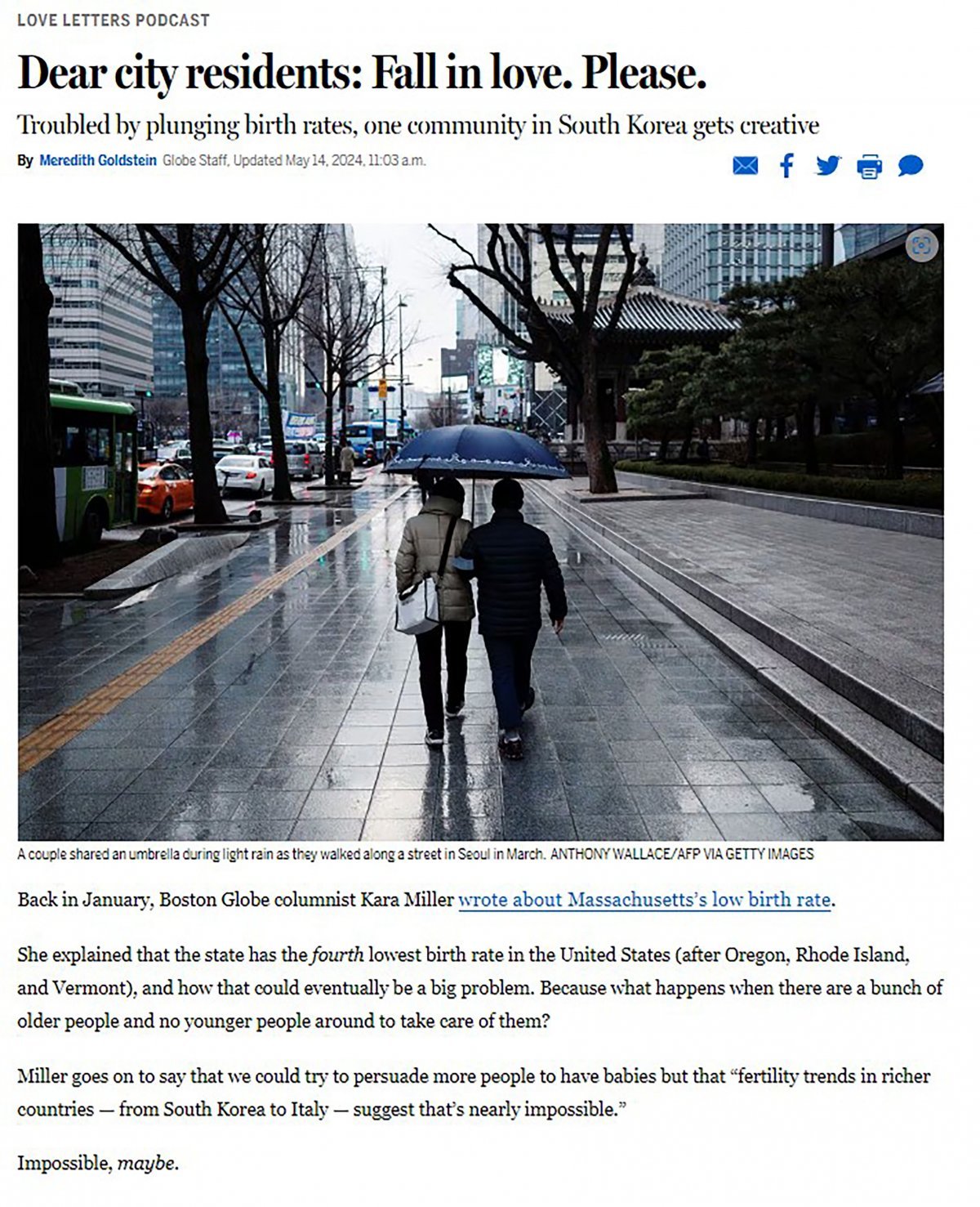 보스턴글로브는 팟캐스트와는 별도로 ‘시민 여러분, 사랑에 빠지세요. 제발’ (Dear city residents: Fall in love. Please) 라는 지난 14일자 기사를 통해서도 팟캐스트에 담은 성남시와 ‘솔로몬의 선택’ 행사 소개 내용을 다뤘다.
