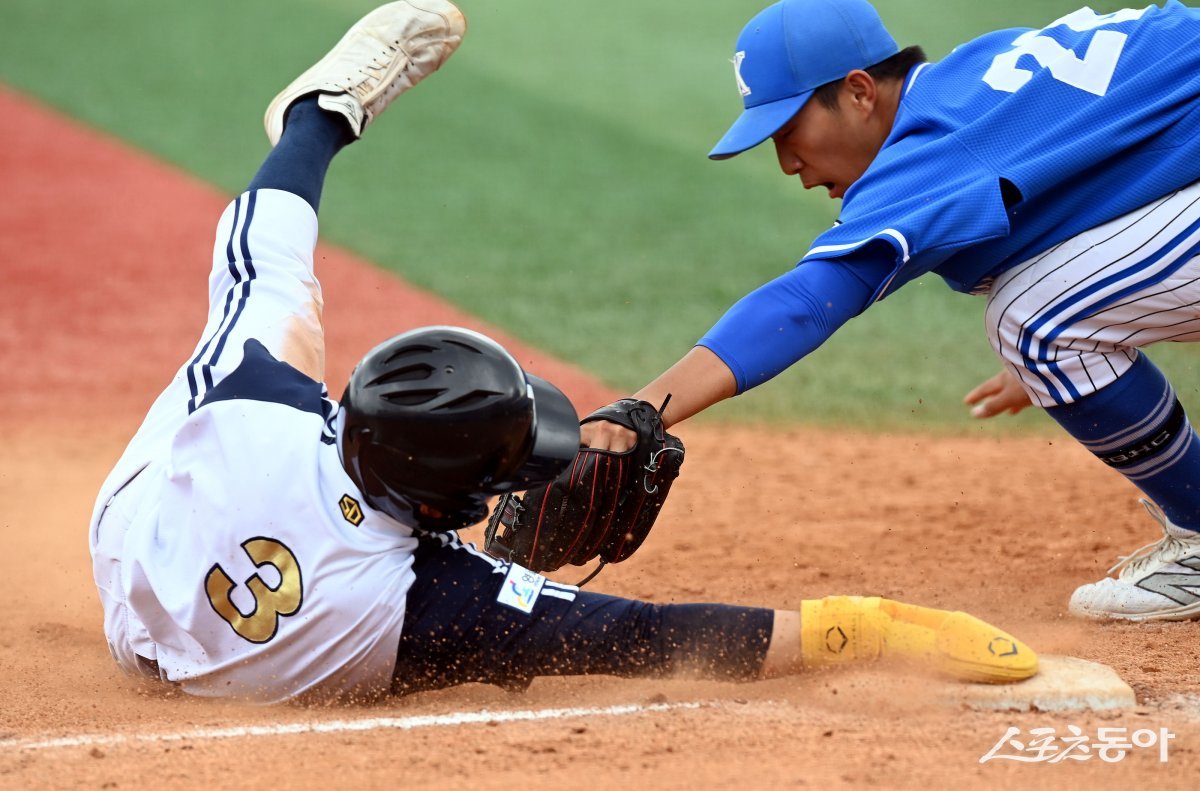 20일 서울 목동야구장에서 ‘제 78회 황금사자기 전국고교야구대회 겸 주말리그 왕중왕전(동아일보사·스포츠동아·대한야구소프트볼협회 공동주최)’ 상동고와 경기고의 경기가 열렸다. 3회초 1사 1, 2루에서 번트 때 상동고 김민서가 3루에서 세이프되고 있다.