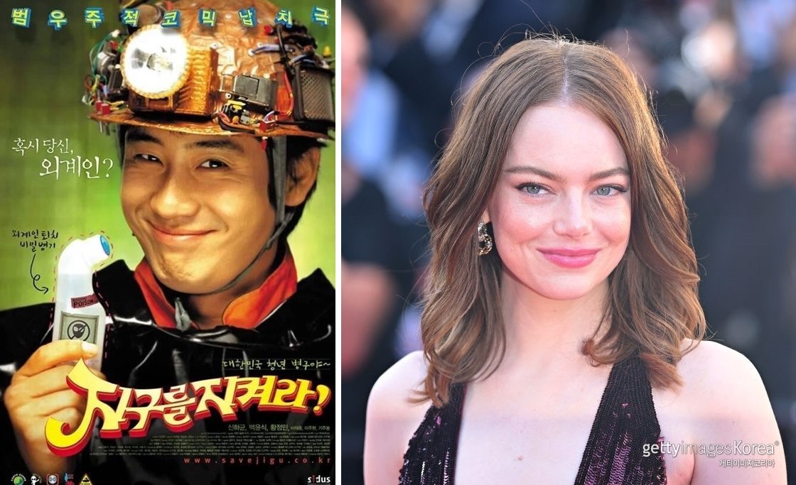 영화 ‘지구를 지켜라’ 포스터(왼쪽), 엠마 스톤. 사진|CJ ENM, 게티이미지코리아
