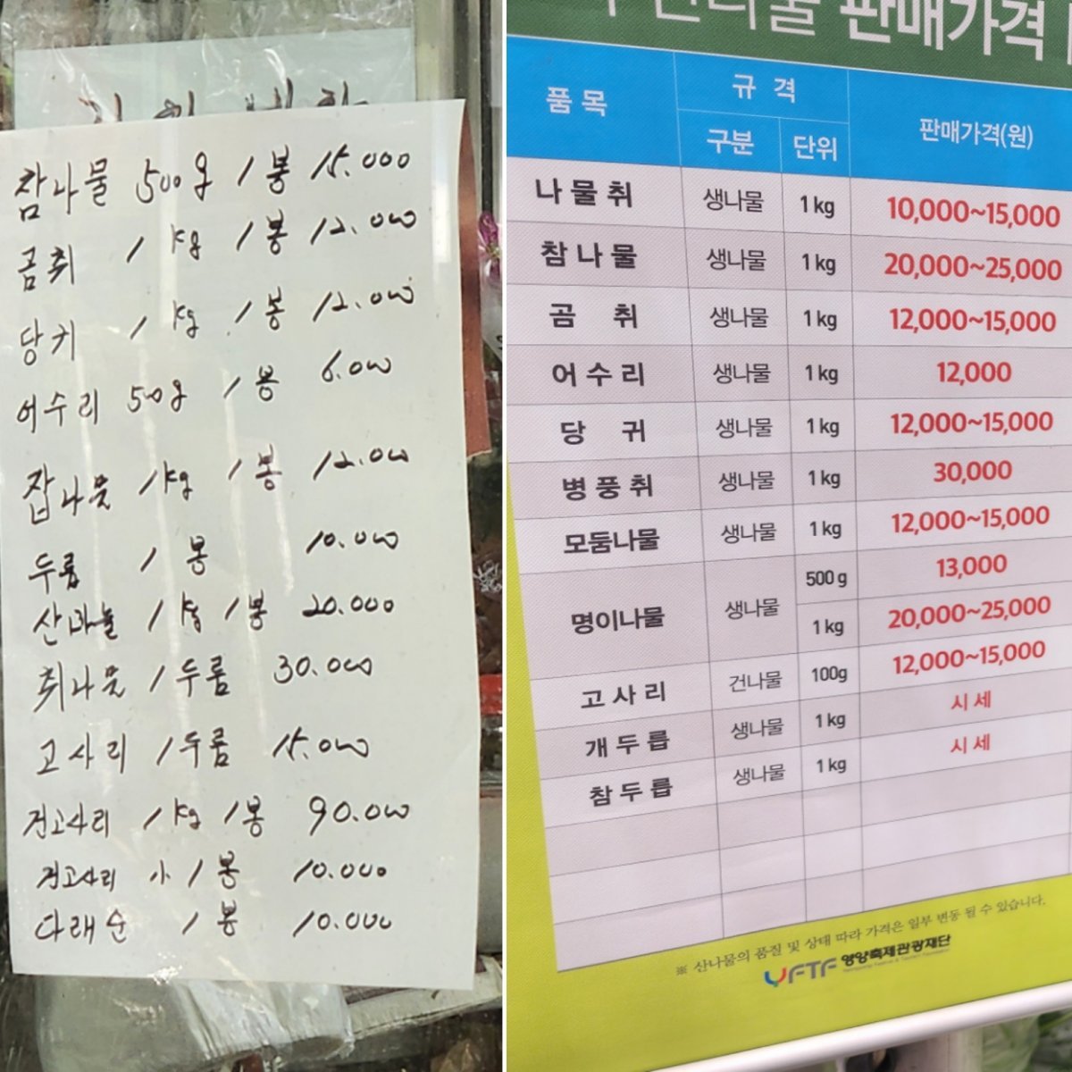 영양산나물축제 가격표