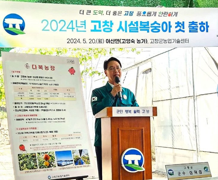 심덕섭 고창군수가 지난 20일 시설복숭아 첫 출하 현장을 방문했다. 사진제공 | 고창군