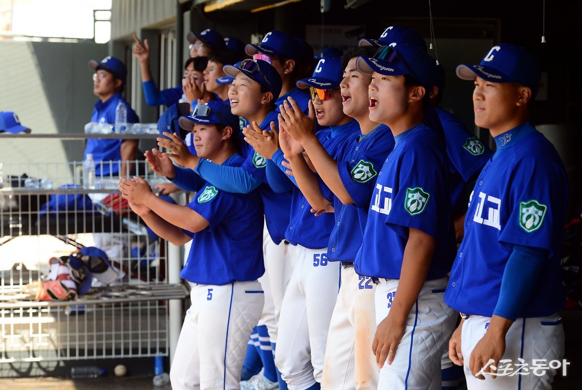 21일 서울 목동야구장에서 ‘제 78회 황금사자기 전국고교야구대회 겸 주말리그 왕중왕전(동아일보사·스포츠동아·대한야구소프트볼협회 공동주최)’ 청원고와 물금고의 경기가 열렸다. 청원고 선수들이 더그아웃에서 응원을 펼치고 있다.