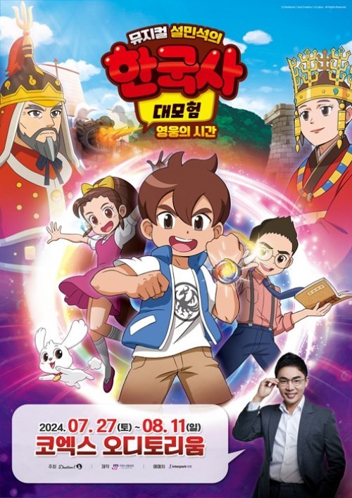 뮤지컬 ‘한국사 대모험’은 서울 및 전국 공연을 통해 인터파크 전체 매출 1위를 달성하는 등 역사 뮤지컬로서 보기 드문 기록을 세웠다. 이번 공연은 코엑스 오디토리움에서 1080석 규모로, 러닝타임은 70분이다. 주요 내용은 이순신 장군과 선덕여왕을 주제로 하며 어린이 관객들에게 교훈과 감동을 선사할 예정이다.