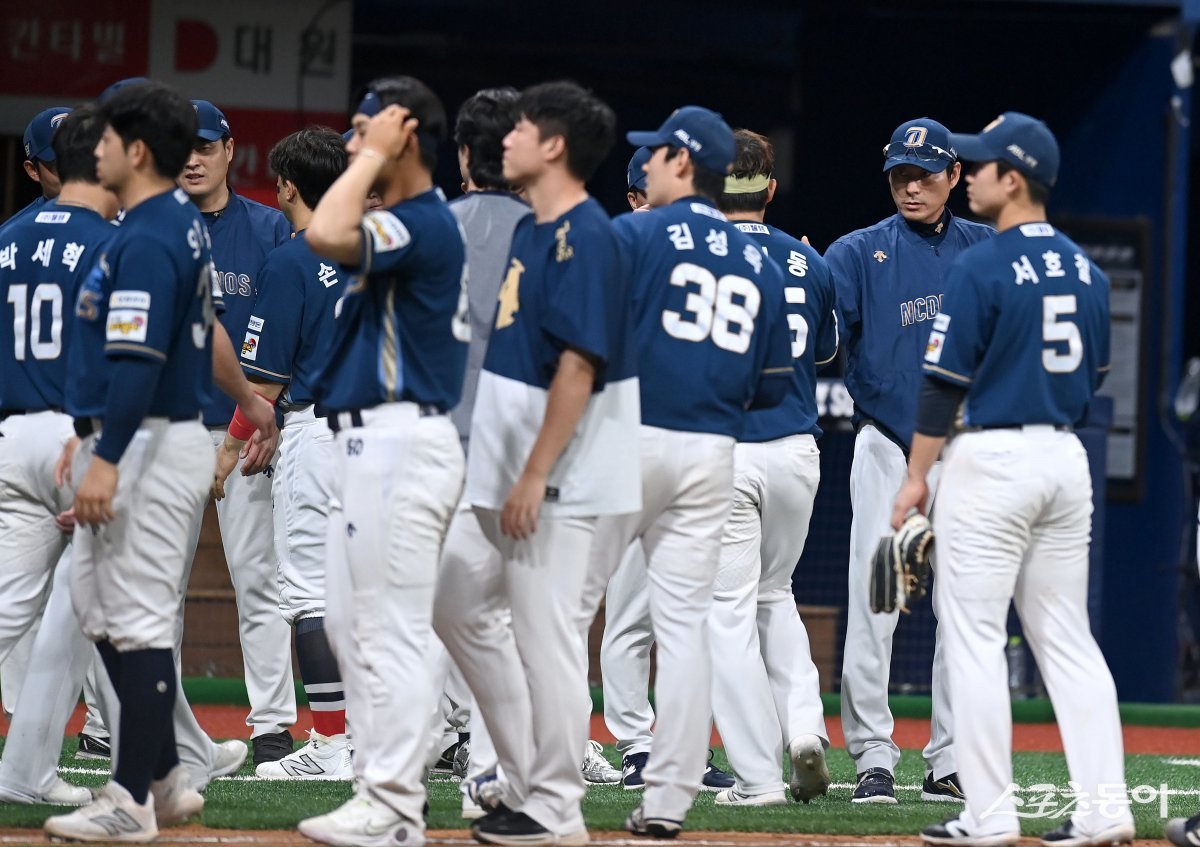 21일 서울 고척스카이돔에서 ‘2024 신한은행 SOL뱅크 KBO리그’ NC 다이노스와 키움 히어로즈 경기가 열렸다. 5-3 승리를 거둔 후 NC 강인권 감독이 선수들과 하이파이브 하고 있다.