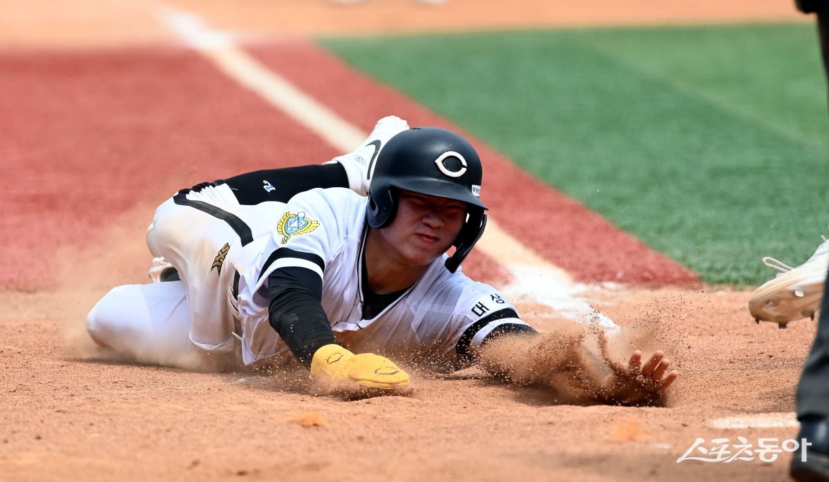 22일 서울 목동야구장에서 ‘제 78회 황금사자기 전국고교야구대회 겸 주말리그 왕중왕전(동아일보사·스포츠동아·대한야구소프트볼협회 공동주최)’ 전주고와 대구상원고의 16강 경기가 열렸다. 5회말 1사 3루에서 폭투 때 상원고 3루 주자 문경원이 득점을 올리고 있다.