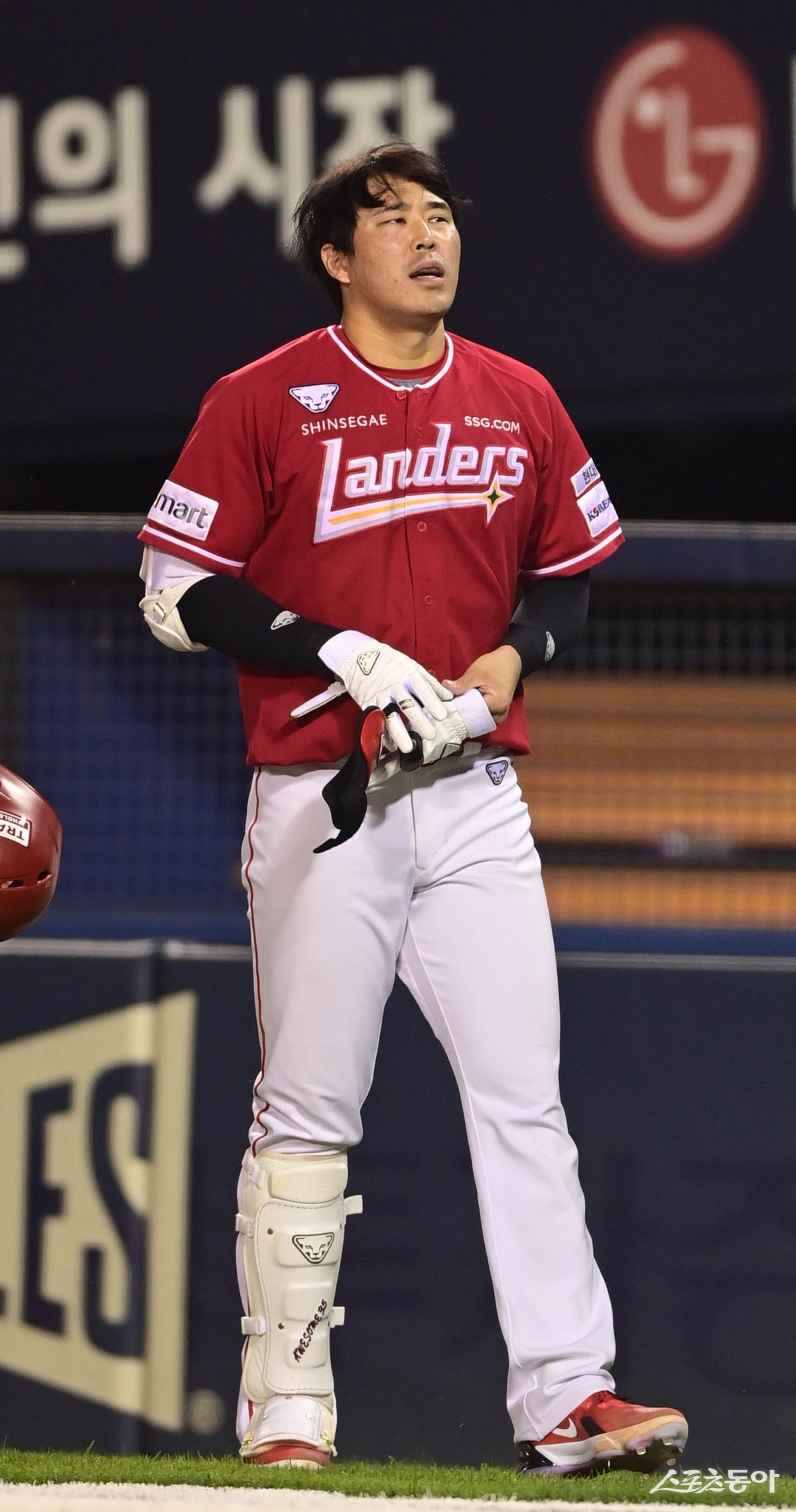 22일 서울 잠실야구장에서 열린 ‘2024 신한 SOL 뱅크 KBO리그’ 두산 베어스와 SSG 랜더스의 경기에서 6회초 1사 1루 SSG 한유섬이 투구된 볼에 맞은 후 통증을 호소하고 있다.