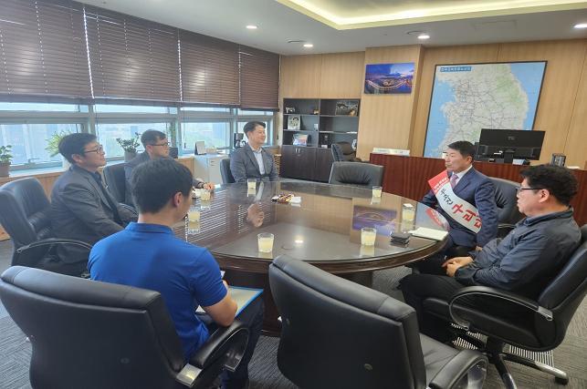백경현 구리시장(오른쪽 두번째)이 22일 경상북도 김천시 한국도로공사 본사를 찾아 박건태 건설본부장에게 구리대교 명명을 요구하고 있다. 사진제공 ㅣ구리시