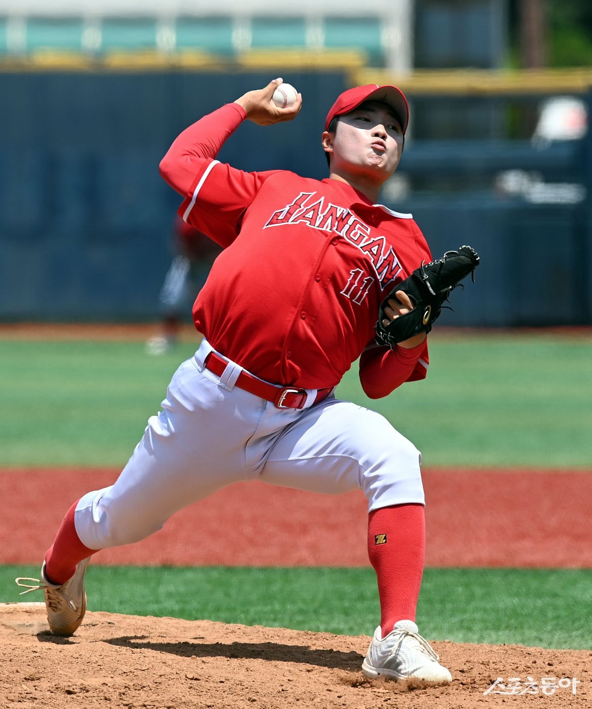23일 서울 목동야구장에서 ‘제 78회 황금사자기 전국고교야구대회 겸 주말리그 왕중왕전(동아일보사·스포츠동아·대한야구소프트볼협회 공동주최)’ 장안고와 광주일고의 16강 경기가 열렸다. 장안고 선발투수 조우진이 구원 등판해 볼을 던지고 있다.