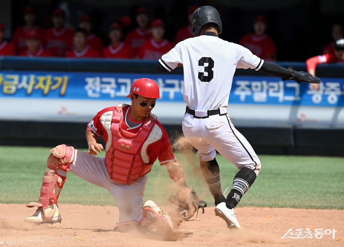23일 서울 목동야구장에서 ‘제 78회 황금사자기 전국고교야구대회 겸 주말리그 왕중왕전(동아일보사·스포츠동아·대한야구소프트볼협회 공동주최)’ 장안고와 광주일고의 16강 경기가 열렸다. 6회말 1사 2, 3루에서 내야땅볼 때 광주일고 김태윤이 홈으로 달렸으나 상대포수에게 태그 아웃되고 있다.