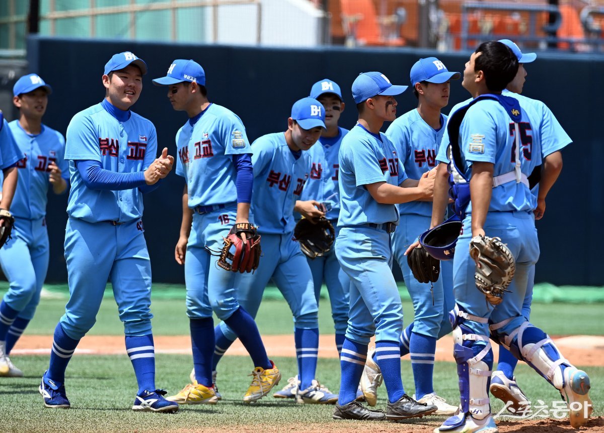 23일 서울 목동야구장에서 ‘제 78회 황금사자기 전국고교야구대회 겸 주말리그 왕중왕전(동아일보사·스포츠동아·대한야구소프트볼협회 공동주최)’ 세광고와 부산고의 16강 경기가 열렸다. 부산고가 세광고를 상대로 3-1 승리를 거둔 후 선수들이 그라운드에서 기쁨을 나누고 있다.