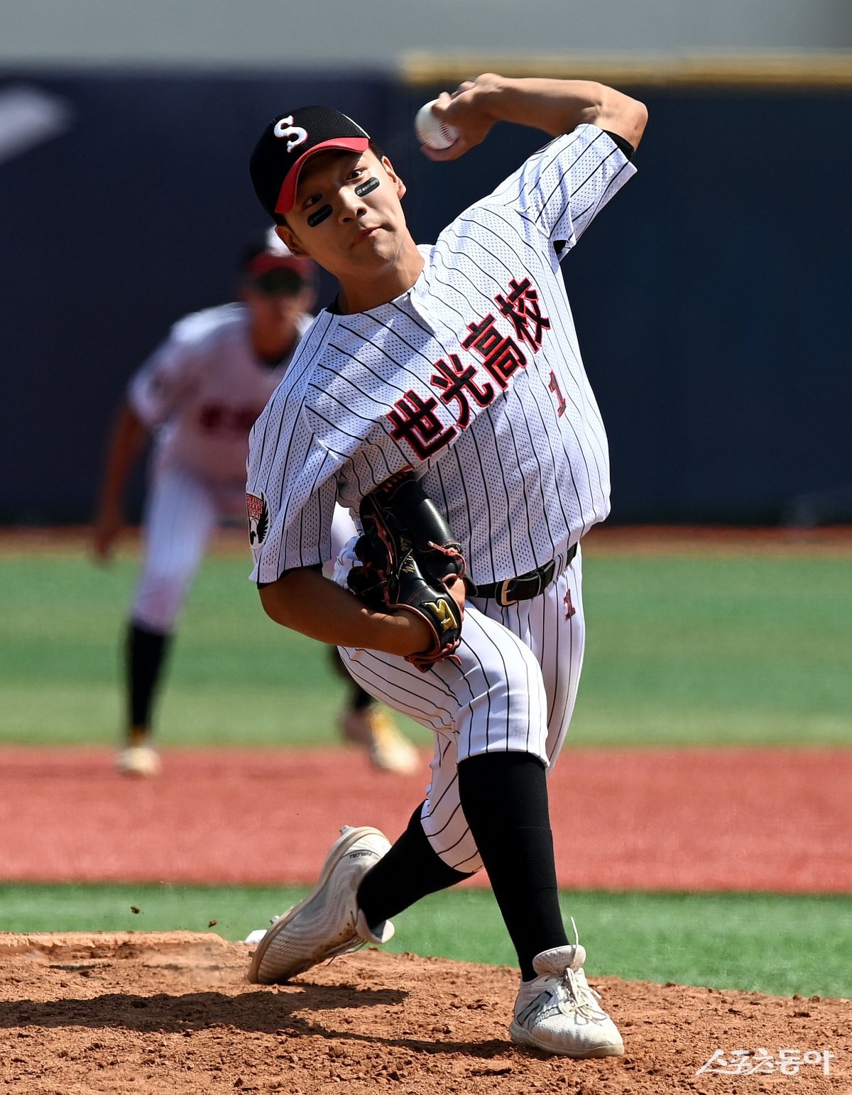 23일 서울 목동야구장에서 ‘제 78회 황금사자기 전국고교야구대회 겸 주말리그 왕중왕전(동아일보사·스포츠동아·대한야구소프트볼협회 공동주최)’ 세광고와 부산고의 16강 경기가 열렸다. 3회말 세광고 권민규가 구원 등판해 볼을 던지고 있다.