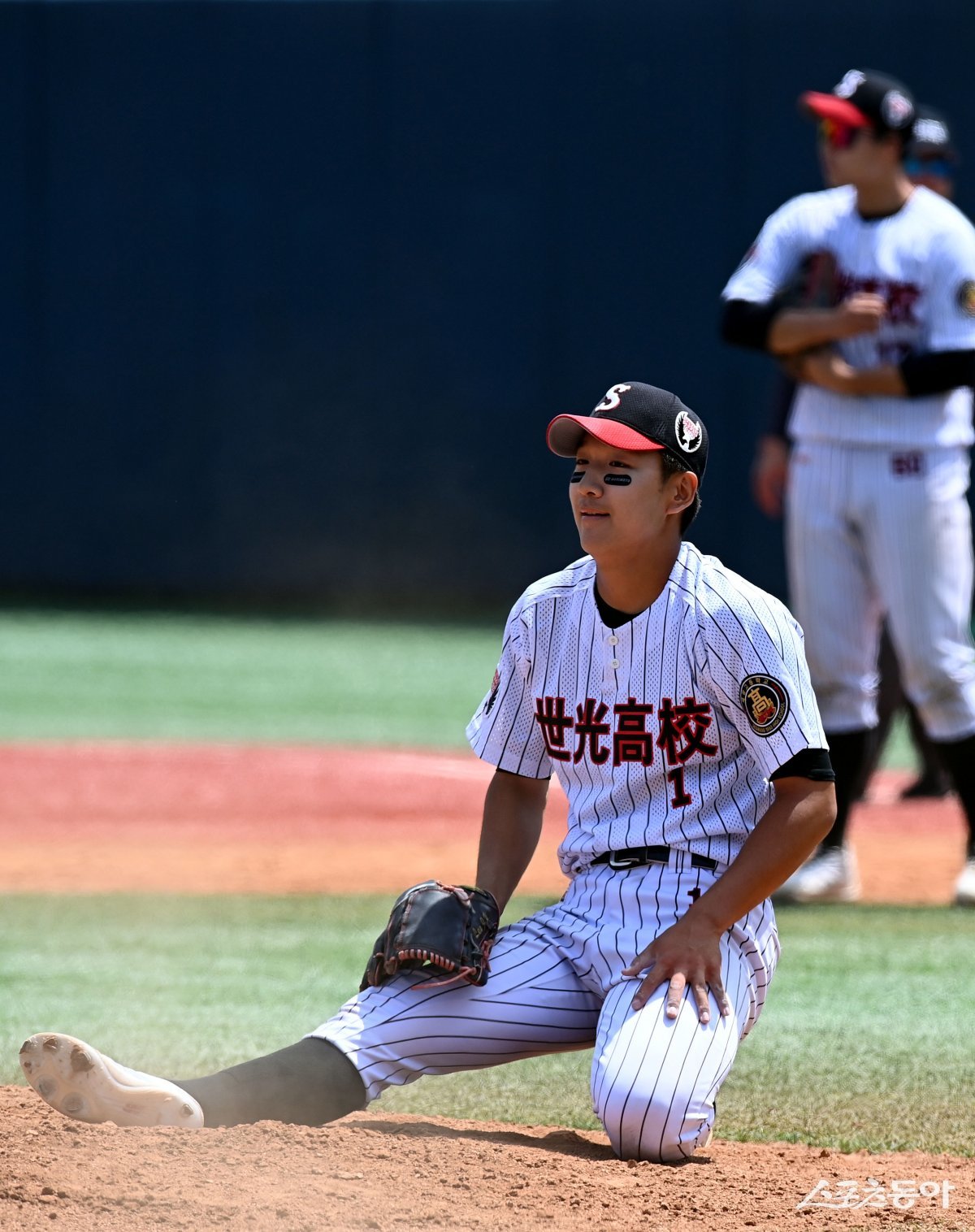 23일 서울 목동야구장에서 ‘제 78회 황금사자기 전국고교야구대회 겸 주말리그 왕중왕전(동아일보사·스포츠동아·대한야구소프트볼협회 공동주최)’ 세광고와 부산고의 16강 경기가 열렸다. 6회말 1사 1, 3루에서 실점을 허용한 세광고 권민규가 아쉬워하고 있다.