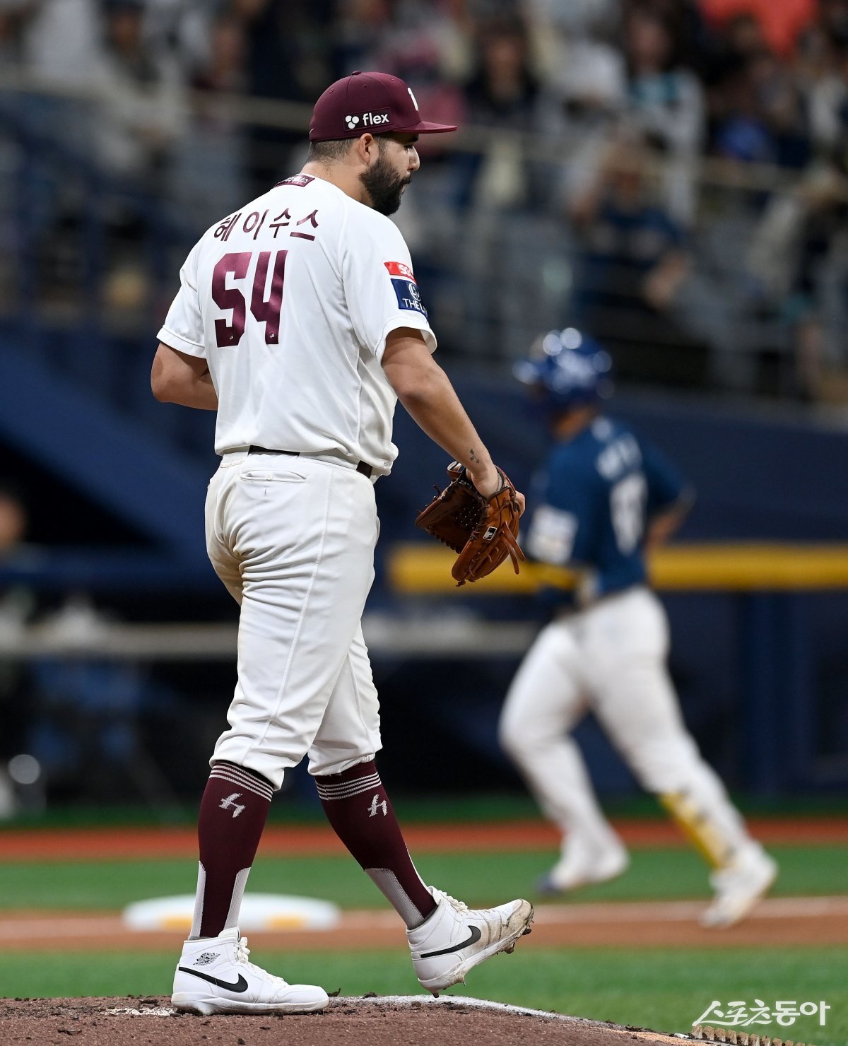 23일 서울 고척스카이돔에서 ‘2024 신한은행 SOL뱅크 KBO리그’ NC 다이노스와 키움 히어로즈 경기가 열렸다. 키움 선발 헤이수스가 7회초 1사 NC 박한결에게 중월 솔로 홈런을 허용하고 있다.