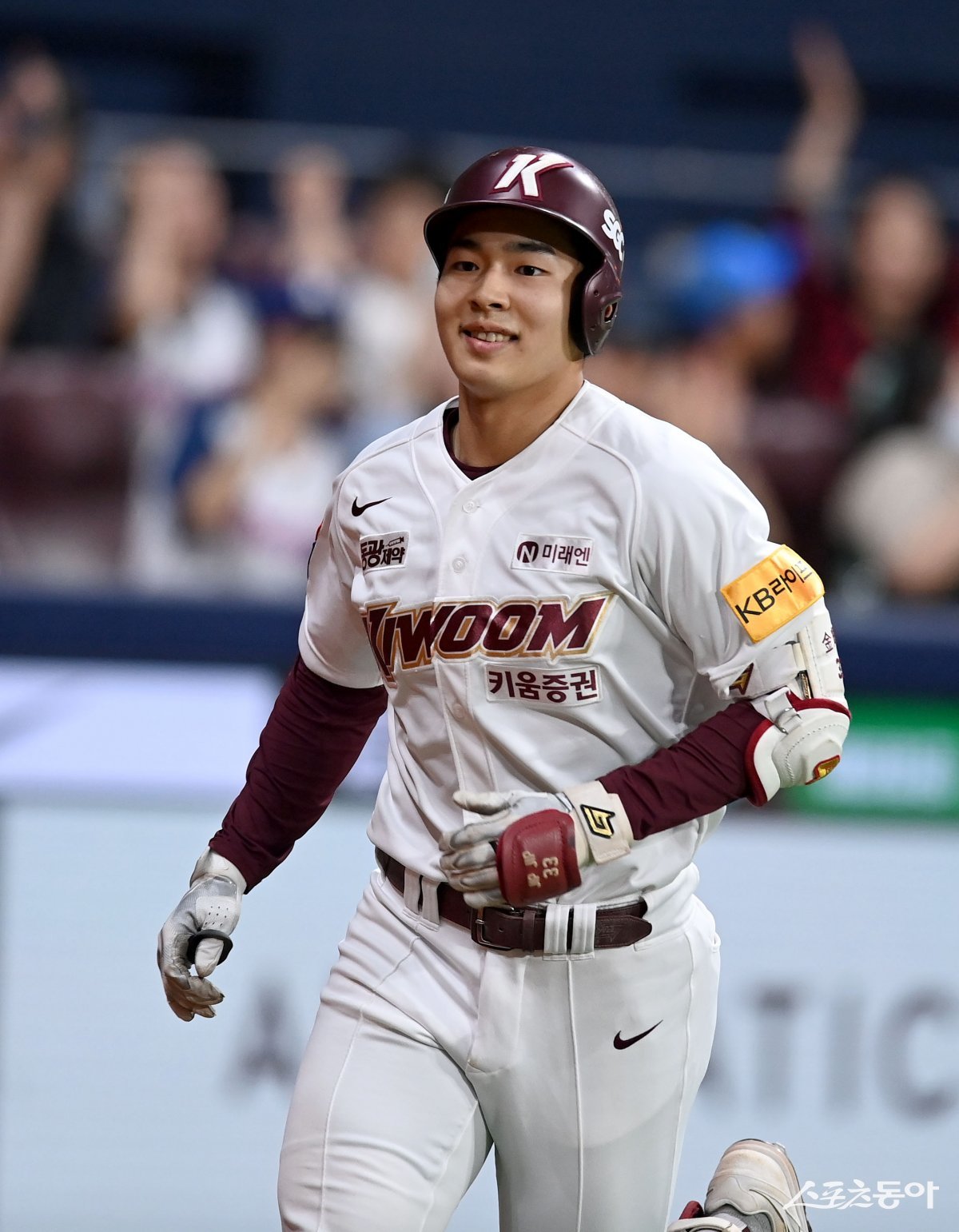 23일 서울 고척스카이돔에서 ‘2024 신한은행 SOL뱅크 KBO리그’ NC 다이노스와 키움 히어로즈 경기가 열렸다. 5회말 무사 키움 김휘집이 좌중월 솔로 홈런을 날리고 그라운드를 돌아 홈인하고 있다.