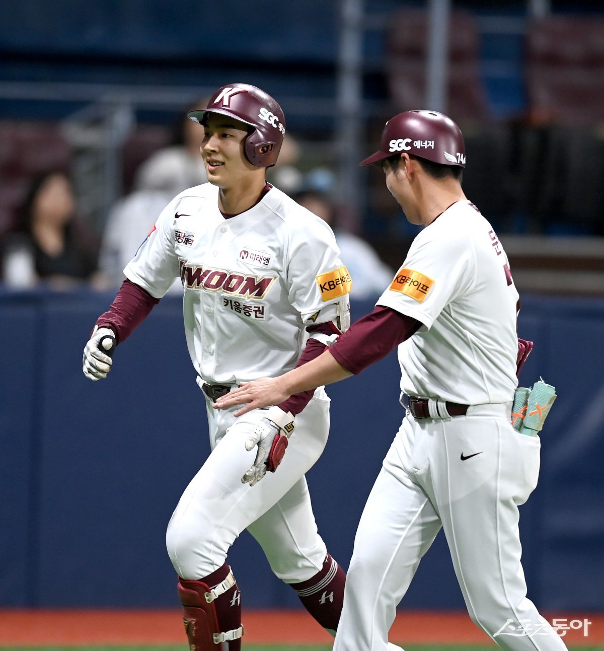 23일 서울 고척스카이돔에서 ‘2024 신한은행 SOL뱅크 KBO리그’ NC 다이노스와 키움 히어로즈 경기가 열렸다. 5회말 무사 키움 김휘집이 좌중월 솔로 홈런을 날리고 그라운드를 돌아 홈인하고 있다.