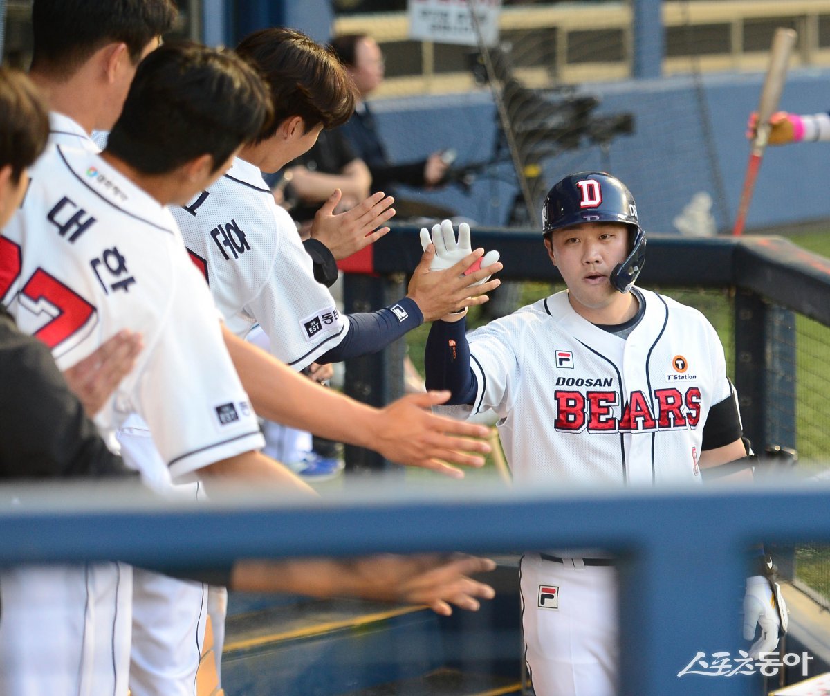 23일 서울 잠실야구장에서 열린 ‘2024 신한 SOL 뱅크 KBO리그’ 두산 베어스와 SSG 랜더스의 경기에서 2회말 2사 2, 3루 두산 양석환이 좌월 3점 홈런을 친 후 더그아웃에서 동료들과 기쁨을 나누고 있다.